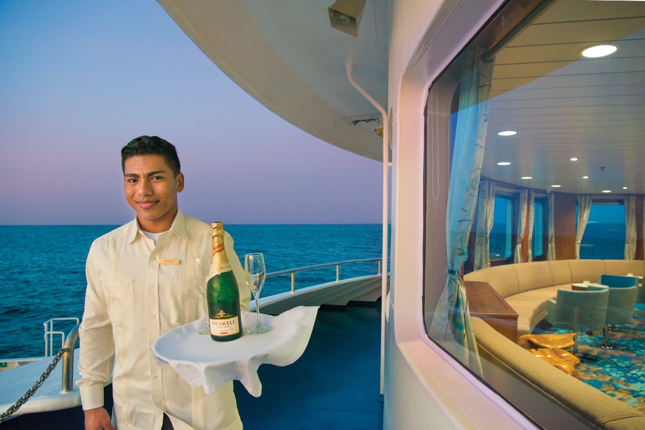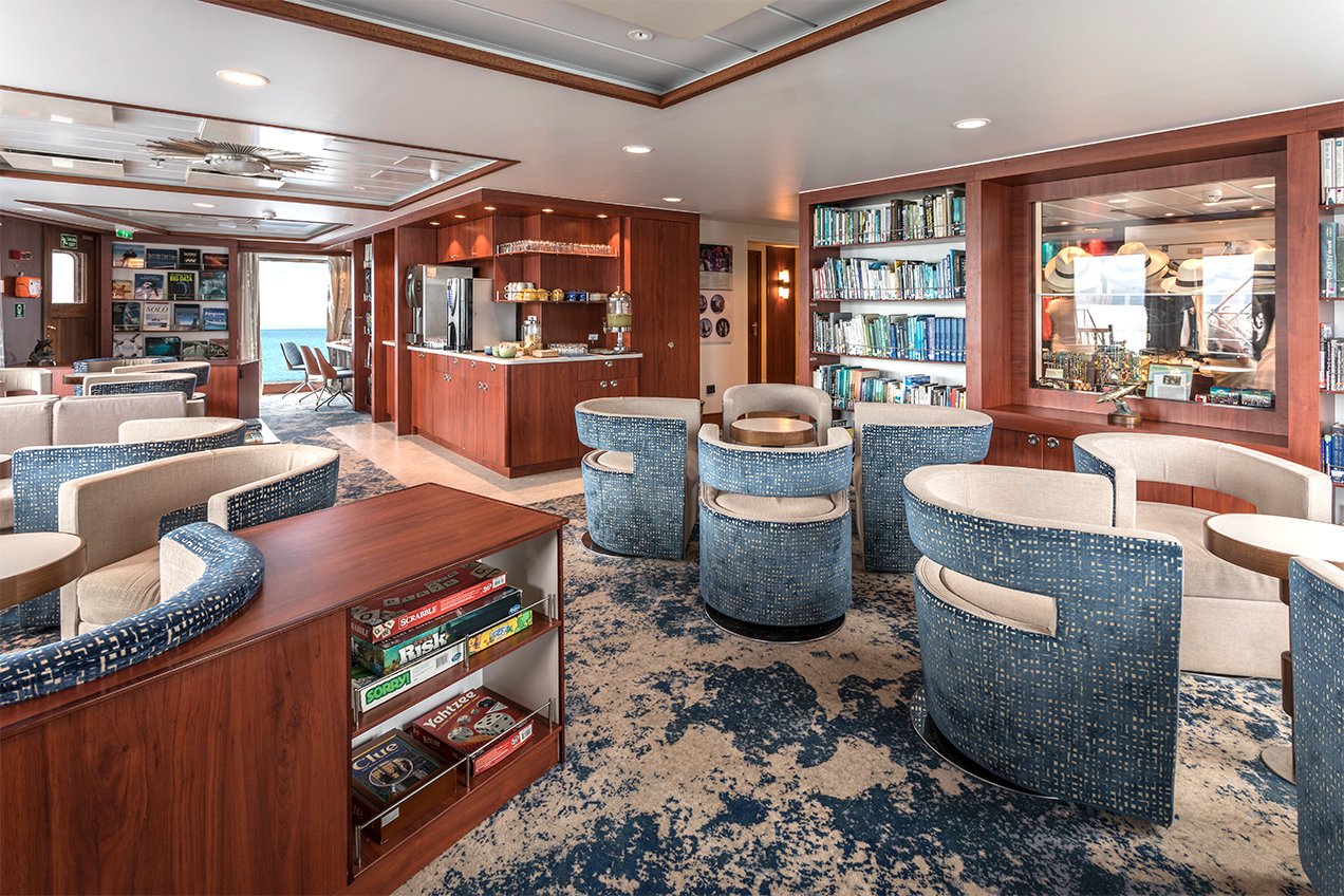Forward lounge and bar accommodating all guests for presentations and gatherings, restaurant, large library with Mac kiosks, open-air observation deck, underwater gear area and dual Zodiac boarding platform, and “open bridge,” where guests can meet the Captain and officers and learn about navigation.