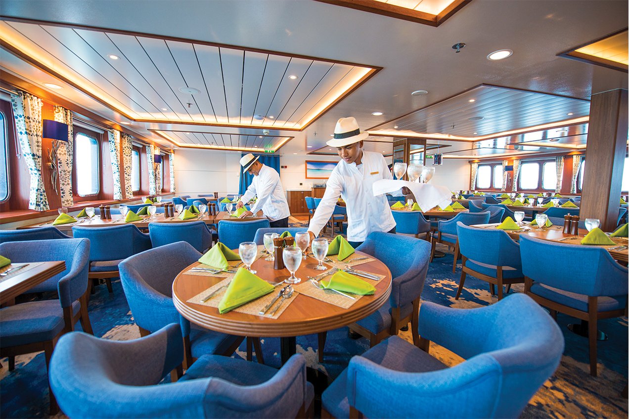 A floor-to-ceiling rebuild when she repositioned to the tropics meant she could be crafted to perfectly accommodate the Lindblad style of travel. Where she previously carried 136 passengers, she now accommodates just 96 guests in 52 thoughtfully appointed cabins. She is exceptionally nimble and maneuverable, with a shallow draft to get up close, great viewing from all public spaces, an expansive open-air observation deck, large windows in cabins and suites, and state-of-the-art tools for exploration including a glass-bottom boat, underwater cameras, video microscope, plus kayaks and stand-up paddleboards.