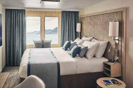 All cabins are outward-facing and feature large windows. All are equipped with climate control, an expedition command center—including tablets, multiple electrical and USB outlets, a TV, barometer, a National Geographic Atlas, and more—a mini refrigerator, small safe, and robes. Bathrooms are outfitted with a rain shower and directional showerhead, botanically inspired products, and a hair dryer. Enjoy luxury linens and pillows, as well as complimentary insulated water bottles.