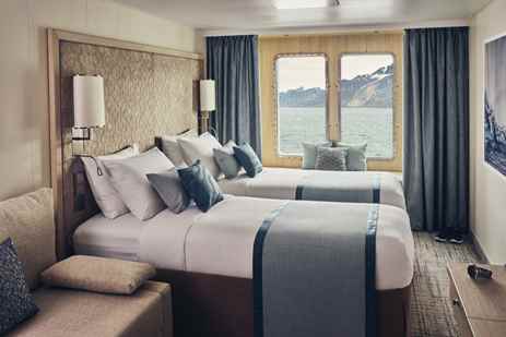 Category 2 cabins, located on the Fore Deck, can be configured with two single beds or one double bed. They feature a two-seat sofa, writing desk and chair, two bedside tables, window alcove seating, and a closet with ample storage.