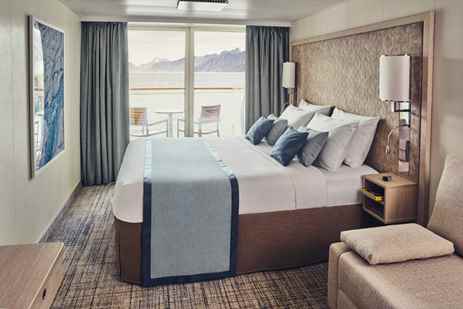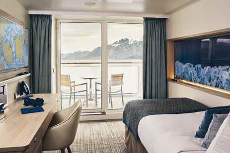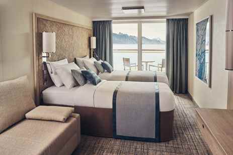 Category 5 cabins, located on the Bridge Deck, can be configured with two single beds or one double bed. They feature a balcony outfitted with two chairs, a table, and a hammock; convertible sleeper sofa; writing desk and chair; two bedside tables; and a closet with ample storage.