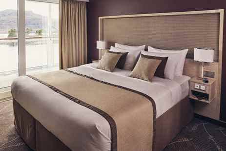 Category 1 cabins, located on the Fore Deck, can be configured with two single beds or one double bed. They feature an armchair, writing desk and chair, two bedside tables, window alcove seating, and a closet with ample storage.