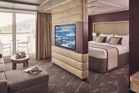 The Category 6 junior suite, located on the Bridge Deck, can be configured with two single beds or one double bed. The balcony, which extends the full length of the cabin, is outfitted with two chairs, a table, and a hammock. The spacious junior suite features a slender privacy wall with TVs on either side, a separate vanity area, convertible sleeper sofa, writing desk and chair, two bedside tables, and a closet with ample storage.