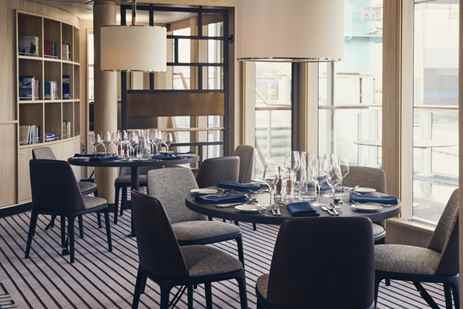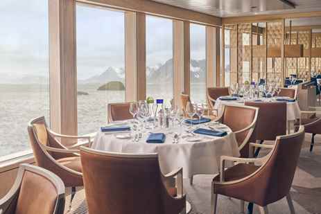 Restaurant 270º on the Main Deck features wrap-around views and provides a window on vital expedition team members: our galley staff as they prepare your meals. This dining area—like all others aboard our ships—features sustainable choices, local where possible, and unassigned, flexible, inclusive seating.
