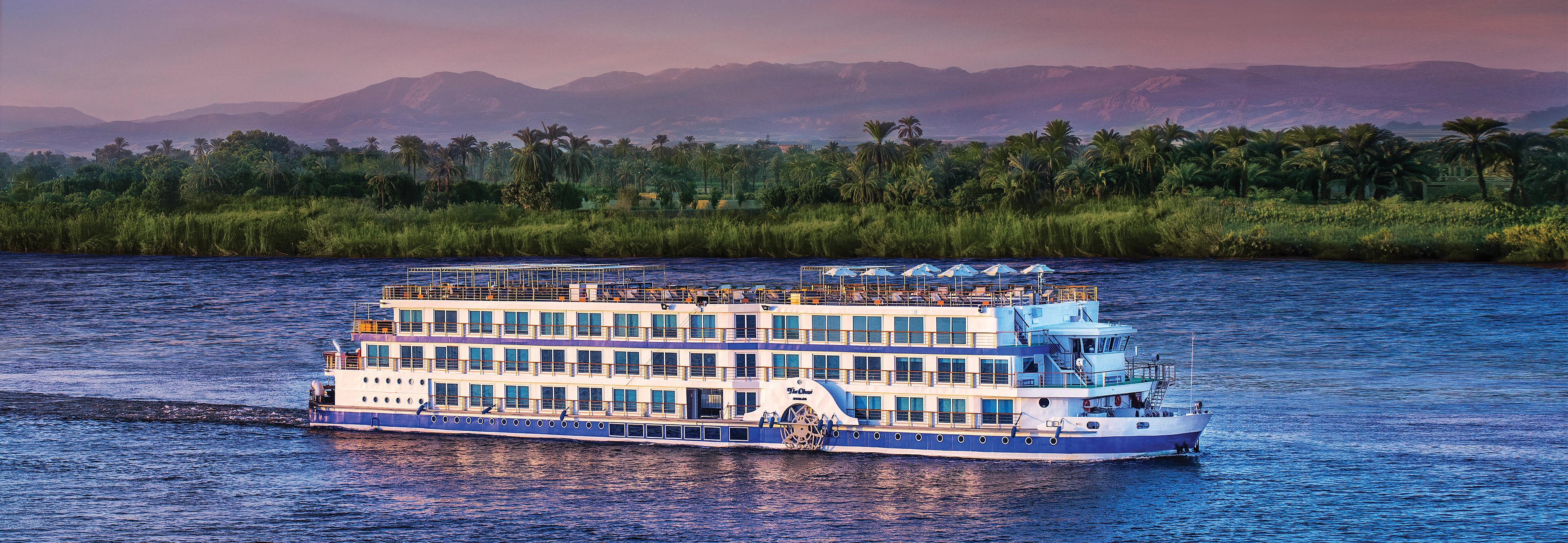 Built in 1996, she was extensively reconfigured in 2015 with just 22 cabins and luxurious amenities, including an Oberoi spa. Windows are nearly floor to ceiling and slide open, offering a connection with the river. The topmost deck has a swimming pool that is the largest of any Nile ship and an alfresco restaurant. Downstairs, there’s a stylish enclosed restaurant serving local specialties as well as more continental options.