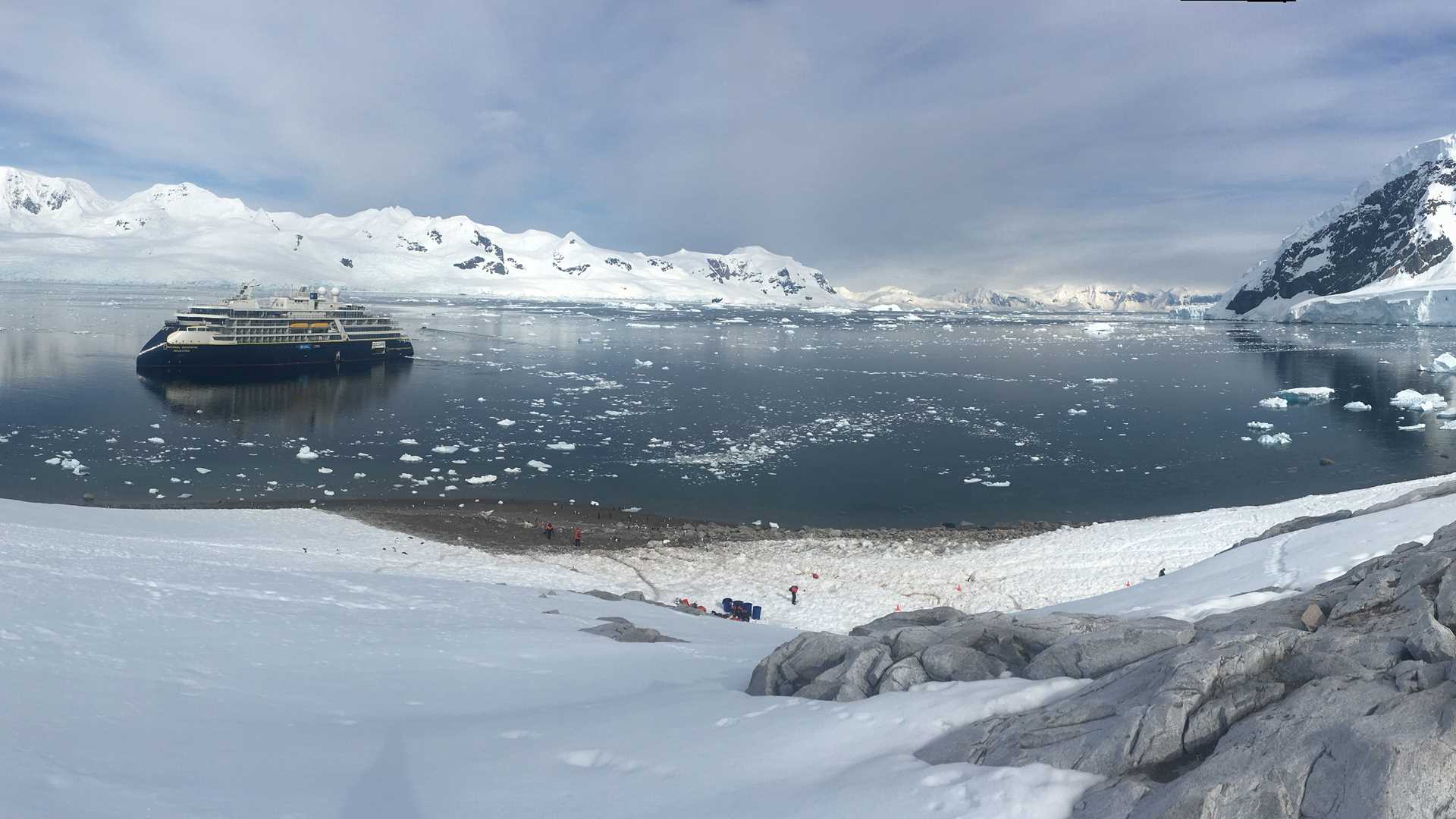A gorgeous Antarctic morning greeted us as National Geographic Resolution slowly entered Andvord Bay, a stunning fjord off the Gerlache Strait. Neko Harbour is a point of land sticking out into the bay next to a heavily crevassed glacier. After breakfast, we boarded Zodiacs under sunny skies to enjoy majestic views of the peaks surrounding this beautiful bay.