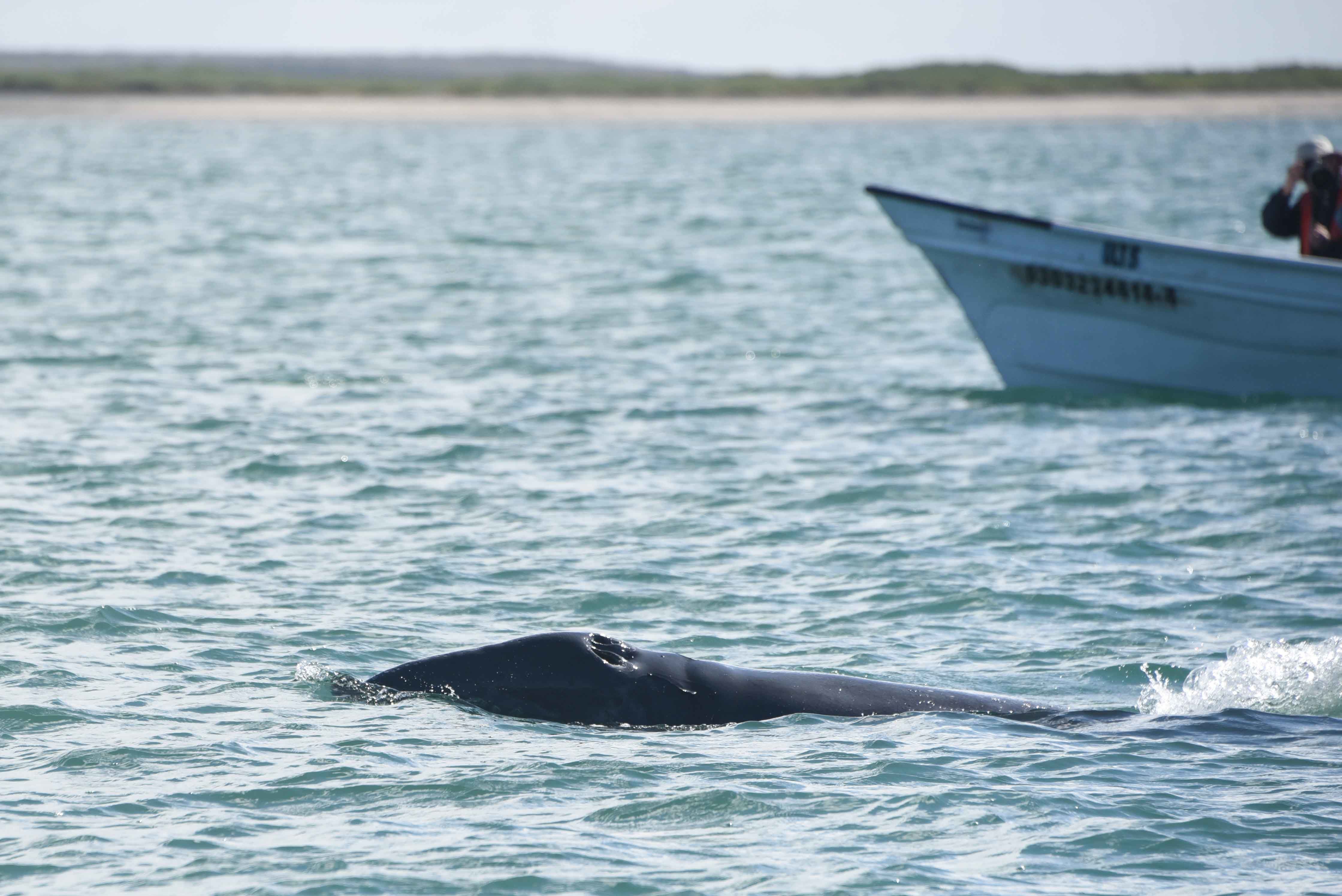 This morning, National Geographic Venture docked at the interesting port, San Carlos. From the 1940s to the 1990s, the port was used for loading agricultural products and fertilizers from the nearby Santo Domingo Valley. Nowadays, San Carlos is basically a place for loading sardines from a local cannery. It is also an important tourist base for whale-watching, principally mating gray whales. At the port, all guests and staff boarded buses to Lopez Mateos, a town located near the northernmost tip of Magdalena Island. The buses traveled across Magdalena Plain, a section of the Sonoran Desert that receives a lot of moisture in the form of dense fog from the Pacific Ocean. Lichens and orchillas, a type of flowering plant, give the desert a phantasmagoric appearance. Guests and staff enjoyed spotting numerous birds, including crested caracaras and kestrels. Once in Lopez Mateos, we boarded local pangas for whale-watching. During two rounds of whale-watching, we encountered several whales close to our pangas. However, most of the whales were preoccupied with traveling, searching for mates, or just finishing their time of reproduction and thus exiting the lagoon. In reality, the whales were not interested in interacting with the boats and their excited cargo, but we had many opportunities to observe the behavior of these magnificent animals. In town, we all delighted in a delicious fish lunch, ‘pescado zarandeado.’ We enjoyed exploring the local dock with its many colorful shops and crafts, and we admired the wonderful sculpture of a cow-calf pair of gray whales.