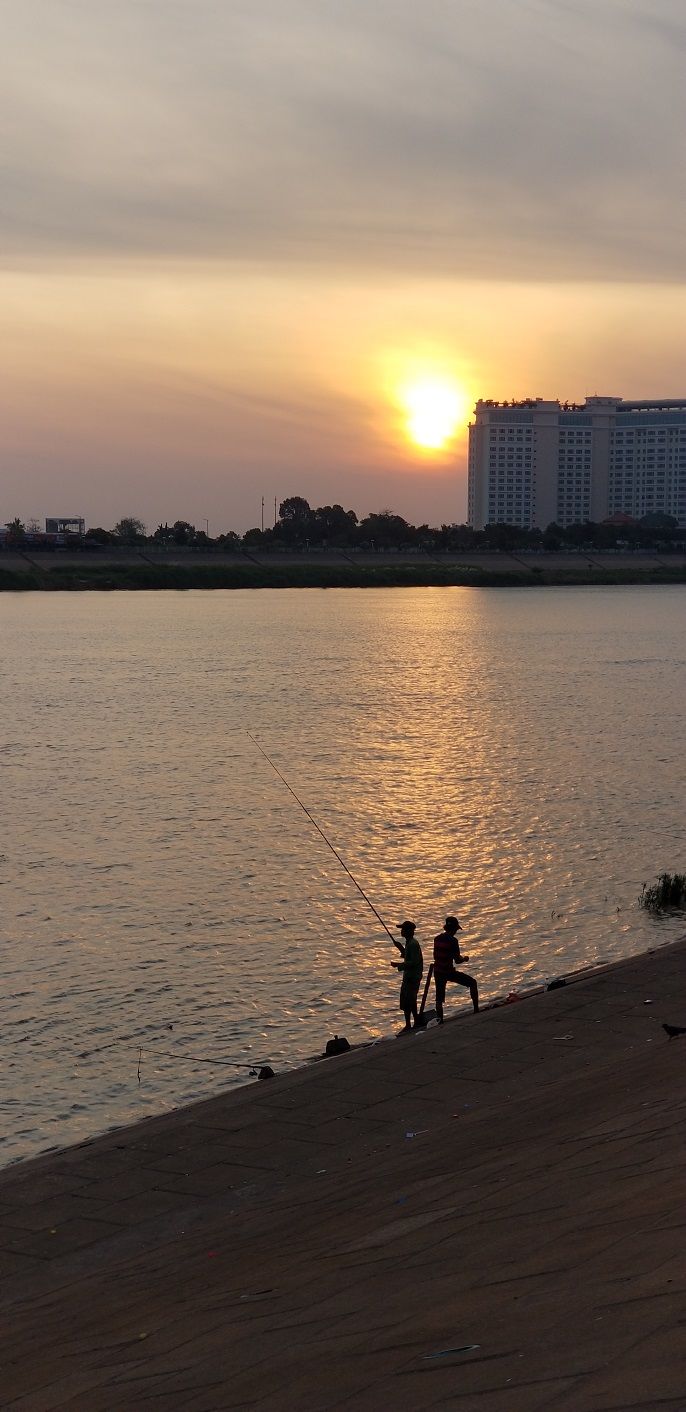 Last night we docked upstream from the capital of Phnom Penh with the colourful light of the city lit in the distance. At dawn, our ship moved downriver to dock near Wat Phnom.