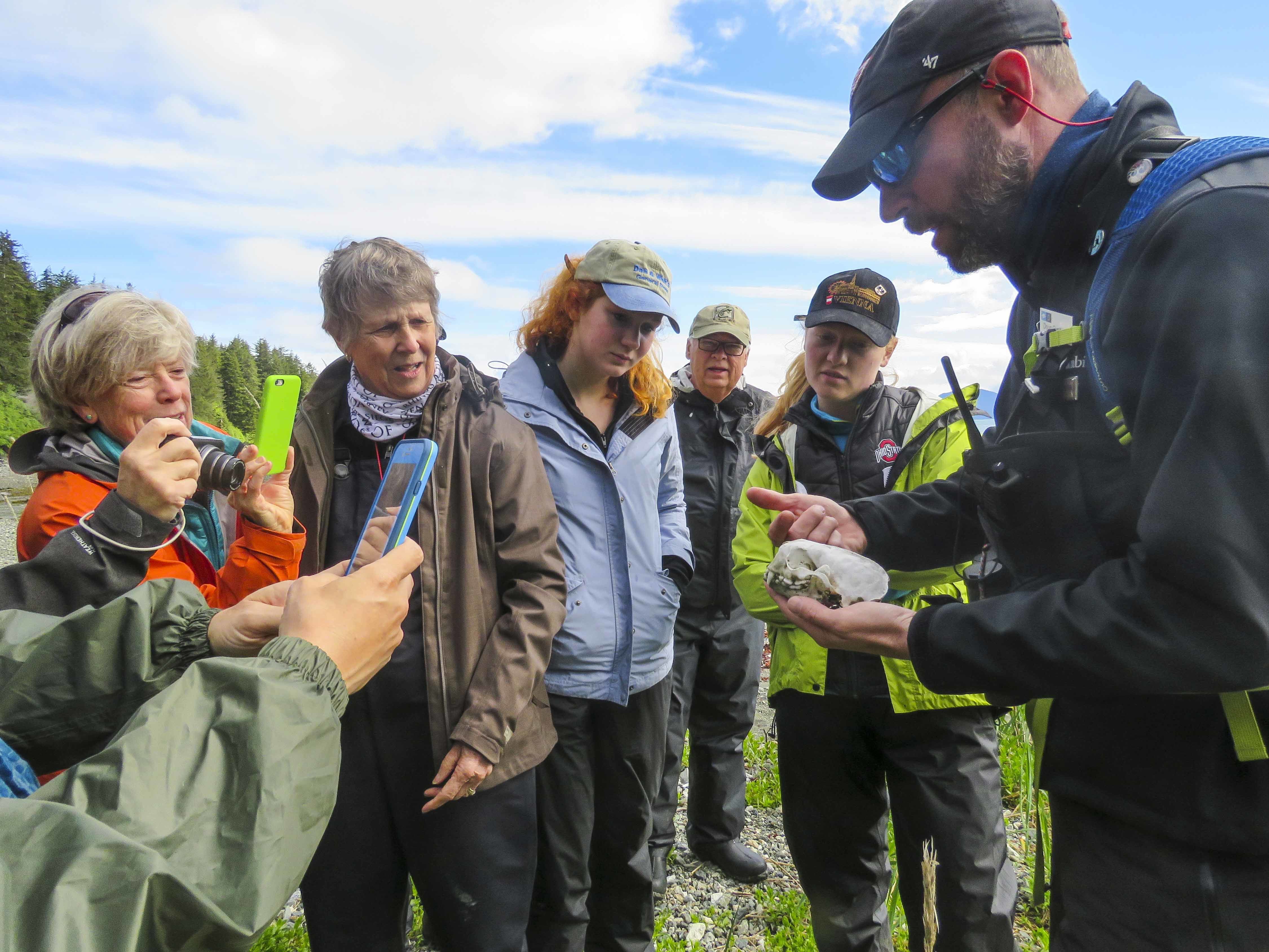 The voyage continues. After navigating through the Lynn Canal and then west to where the Cross Sound and the Gulf of Alaska meet, we anchored in Granite Cove, where our adventures began. In true Lindblad form, we rode Zodiacs from National Geographic Sea Bird to George Island, a former outpost during World War II. Just as we stepped onto the rocky shore, the clouds parted, and sunshine beamed upon us as if to welcome our exploration. Groups set out by foot and by kayak to take in the sights. We found a multitude of colorful lichens in the forest, seaweed on the beach, and sea stars in the tidal zones. No matter where we explored, we were bound to get great photos. Back on board, there was a buzz of chatter during lunch as we compared notes on what we saw. A quick repositioning of National Geographic Sea Bird brought us to “the Hobbit Hole” in the Inian Islands archipelago. Here, the color of the water is a striking teal. It’s the only entrance for the Pacific Ocean to pour nutrient-rich waters into the northern reaches of Southeast Alaska, so the chances of seeing marine mammals and seabirds are good. The afternoon Zodiac runs did not disappoint. We saw sea otters, harbor seals, rhinoceros auklets, and bald eagles…oh my! As we headed back to the ship in our Zodiacs, a light, cool drizzle began and gave way to a brilliant rainbow, uninterrupted by the buildings, traffic, or crowds we’re accustomed to. Lucky for us, we have a couple more days for moments like this one on our floating home.