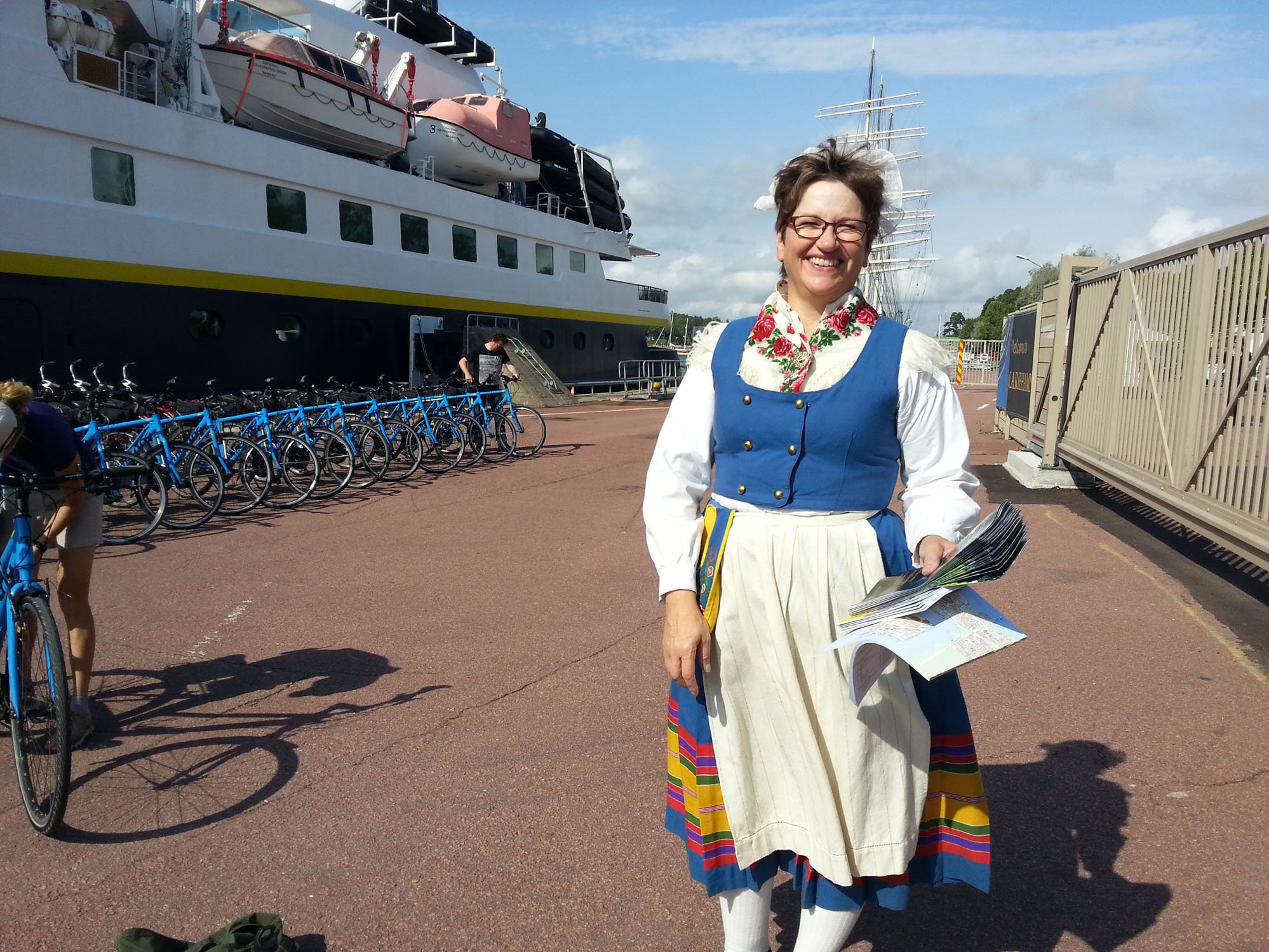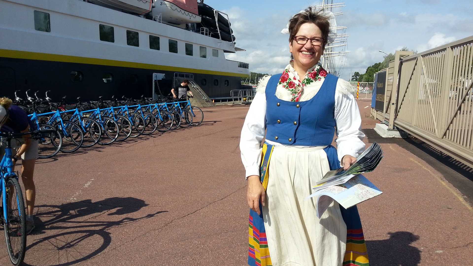 I was greeted on the quayside in the port, Mariehamn (Marie’s Harbour) by Dagni, in historical costume, which was impressive enough, but not as impressive as the sight of the majestic four-master Pommern, the only bark of its kind that is still fully rigged out. It’s part of the Åland Maritime Museum, recently awarded “museum of the year” in Finland. I joined the bus tour, through Mariehamn and on to the historic church at Norby and the former artists’ colony in the tiny village of Önningeby.