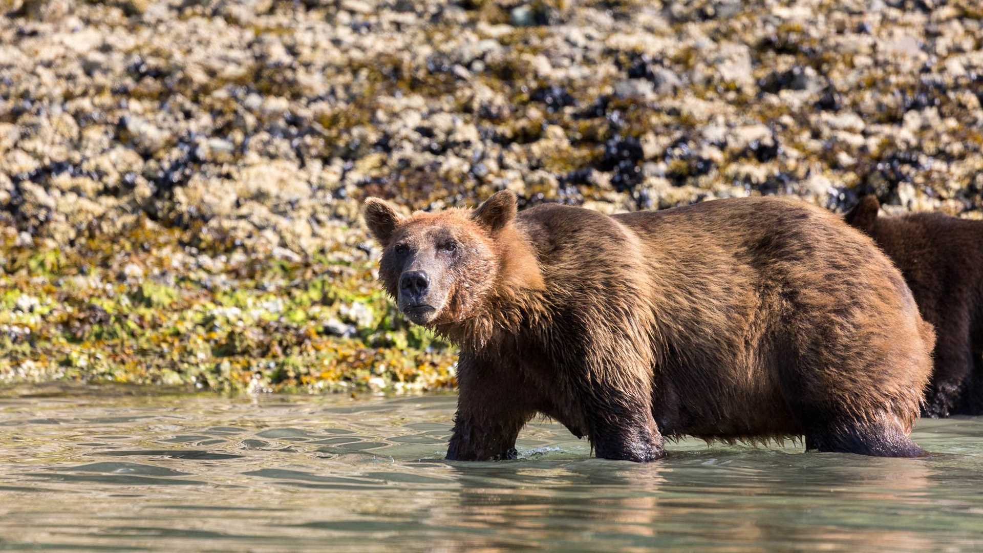 Zodiacs set off for two rounds of cruises among the myriad of small islands that make up this magnificent harbor. We quickly found brown bears in the water, poking among the rocks, and perusing the shoreline in search of food. The tide was out, the table was set, and bears were there to feast on the tidal bounty. We found many females and their cubs exploring the tidal zone while other bears were moving along the shoreline.