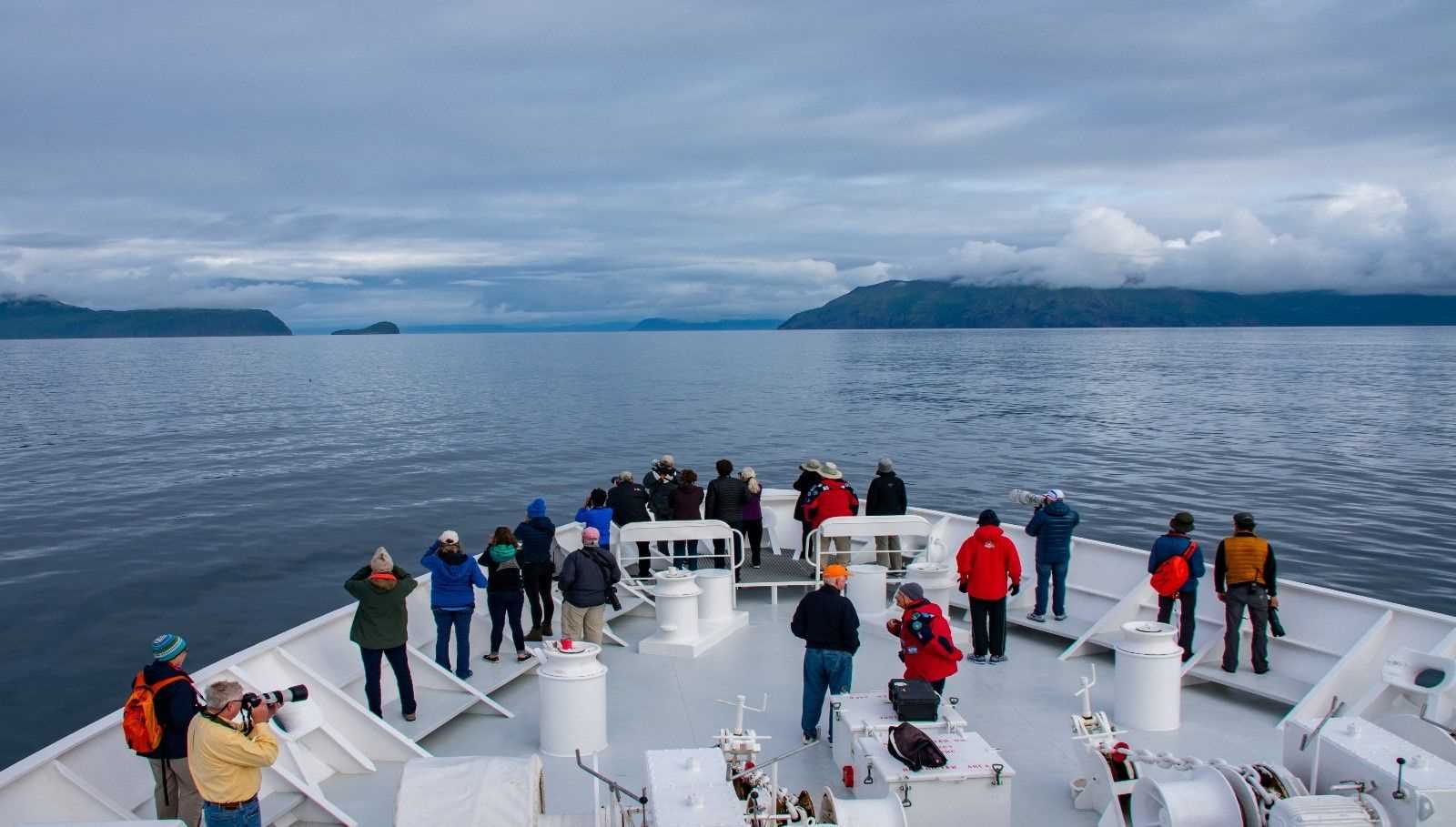 National Geographic Orion spent the day at sea sailing toward Dutch Harbor. It was a great day filled with wildlife, educational presentations, and fantastic views. In between time spent on the bow looking for whales there were presentations about World War II in Alaska, the geology of the Aleutian Islands, sustainable fishing in the Bering Sea, and the sea birds of the Aleutians. While on the bow, everyone was treated to fin whales, humpback whales and minke whales. The entire time sea birds like shearwaters and puffins surrounded the ship.