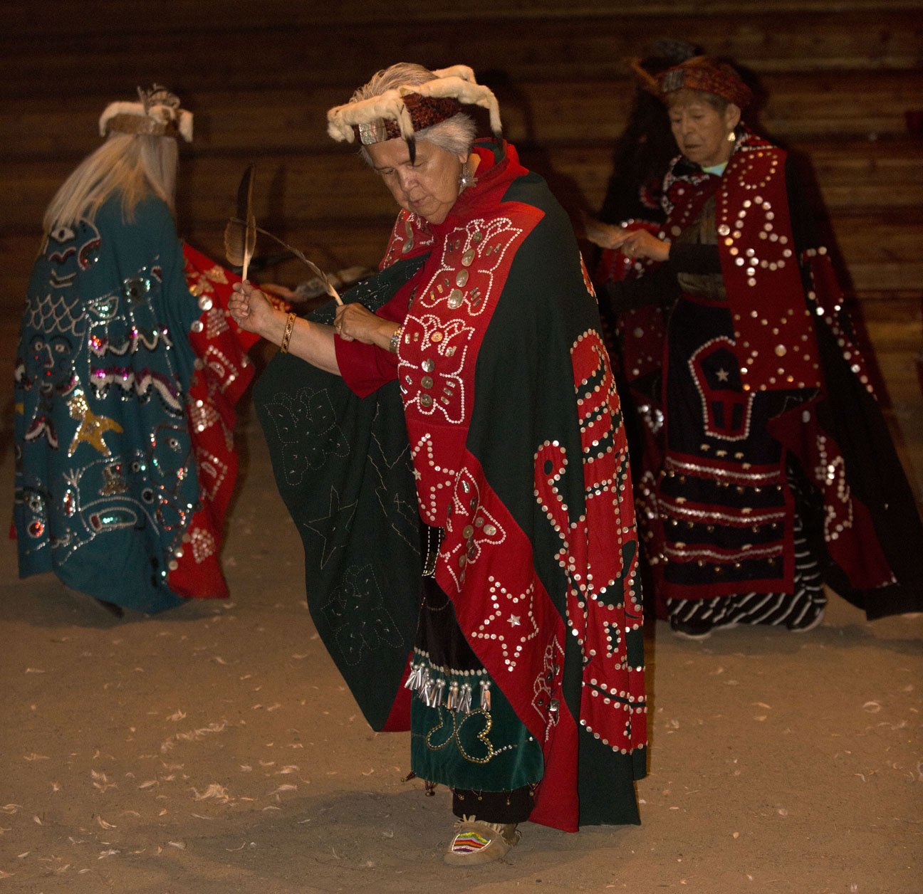 Arriving at the Government Dock in the center of the town of Alert Bay at approximately 8:30 am we prepared for a wet day. The Captain and crew of the Sea Lion finished all preparations for a morning stay dockside. We disembarked and traveled a short distance to the U’mista Cultural Center where we were welcomed by the Namgis people of the Kwakwaka’wakw Nation. This extraordinary museum was opened in 1980 and houses one of the finest collections of elaborately carved masks and regalia used in the Kwakwaka’wakw potlatch ceremony. These pieces were confiscated by the Canadian government in 1921 from a potlatch, held on nearby Village Island. The First Nations community of Alert Bay never forgot the loss of this valuable regalia and in the 1960’s began petitioning the Canadian Government in Ottawa for the return of their potlatch regalia. The Canadian government stipulated a condition of the return of all items - the building of a museum to house them. Among the Kwakwaka’wakw a ransom can be paid for the return of items or captives taken in a raid. In Kwak’wala the word for payment of ransom of returned items is U’mista. Hence the U’mista Cultural Center was built and named, and very often called, with great affection by elders in the community, “our box of treasures.” Through the hallways we wandered, guided by Trevor, who is well versed in Potlatch tradition and regalia. After taking time to see as much as we could in the many rooms we dressed again in rain gear and began a shorter journey slightly west to the gukwdzi or Big House. As we approached we could see the smoke coming out of the smoke hole in the top of the house…a large and lovely warm fire was set and as we entered into the Big House world we were welcomed once again; this time by the T’masala Cultural Group. A tradition among many of the Northwest Coast people is a practice called cultural sharing. As soon as everyone was comfortably seated on wooden benches, elder Vera Newman came forward to welcome us all into a world of ceremony and tradition going back many generations to the mythic age when all human beings, supernatural creatures, shape shifters and beings of the natural world spoke to each other…in balance.
