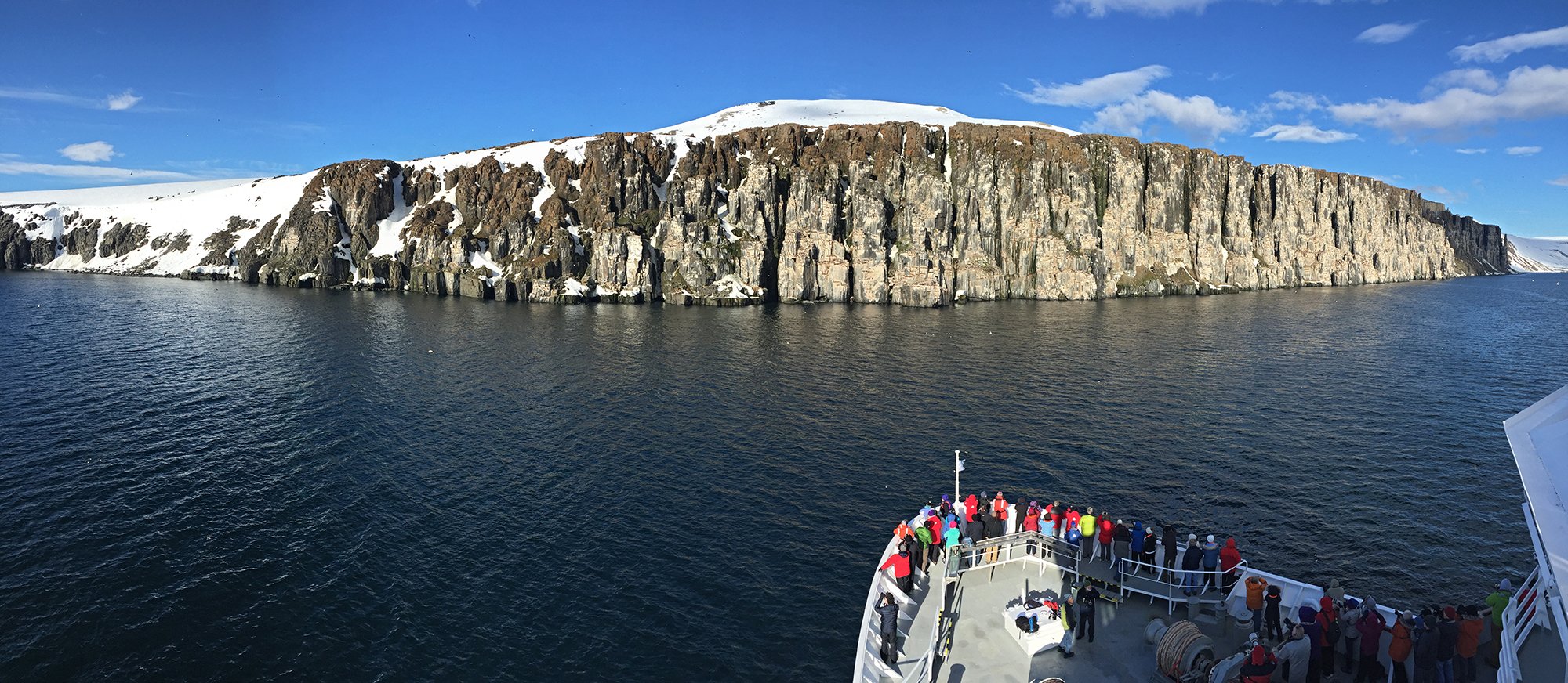 We hardly had time to catch our breath from our adventures up in the ice north of Svalbard when we received the early morning wake up call. We were told that the day was sunny and that the ship was close to Alkefjellet, the impressive bird cliffs on the northeastern coast of the island of Spitsbergen along the coast of Hinlopen Strait.