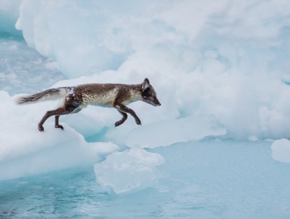 But wait…what is that little brown and white animal sprinting from ice floe to ice floe under the cliff and beneath the cacophony of all those birds? Closer inspection identifies the small frenetic creature to be an arctic fox, just emerging from its winter white coat into its summer brown coloration. The fox darts here and there and seemingly everywhere as it easily leaps from land to floating ice and back again. At one point a large glaucous gull actually dive bombs the fox, but it manages to escape unscathed. The fox must feel that it is raining manna from heaven as eggs, and even an occasional bird, fall from the narrow ledges above, only to become an early fox lunch.