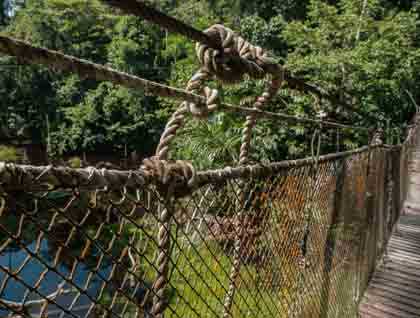 The trip to the bridge is in itself worth the walk as we learned about the various types of vegetation from our local guides. We learned what tree to remove sap from if we want to get rid of parasites; which vines make the best rope for securing a thatch roof on a home; and how to construct a blow gun if we find ourselves in need of a hunting implement. We were enchanted by the stories our guide told us of growing up in a small village in the forest. We reach the suspension bridge and the moment of truth. The bridge seems to have a rhythm all its own as each person steps onto the walkway high above the forest floor. Although we were surrounded by a net to ensure our safety, it was still a little unnerving not having the steady feel of Mother Earth beneath our feet. It did not take long however, and we were negotiating each segment of the bridge with more and more confidence.