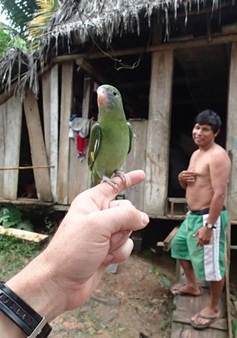 After an interesting presentation on native fruits of the Amazon by our local guide Adonay, we visited the community of San Jorge. The population of roughly 700 people is one example of the many human establishments along Amazonía and within the Pacaya Samiria Reserve. We talked to the locals and learned about their traditional ways of living. We were welcomed at a couple of the houses and our guides interpreted interesting conversations, which opened a window to the customs and traditions of the Peruvian Amazon. One of the fun parts of the day was to play with a friendly white-winged parakeet that was kept as a pet at one of the homes. After that, we enjoyed a soccer match between some of the crewmembers and the local team. Even if the locals tuned out to be the victors, we all cheered and celebrated the game.