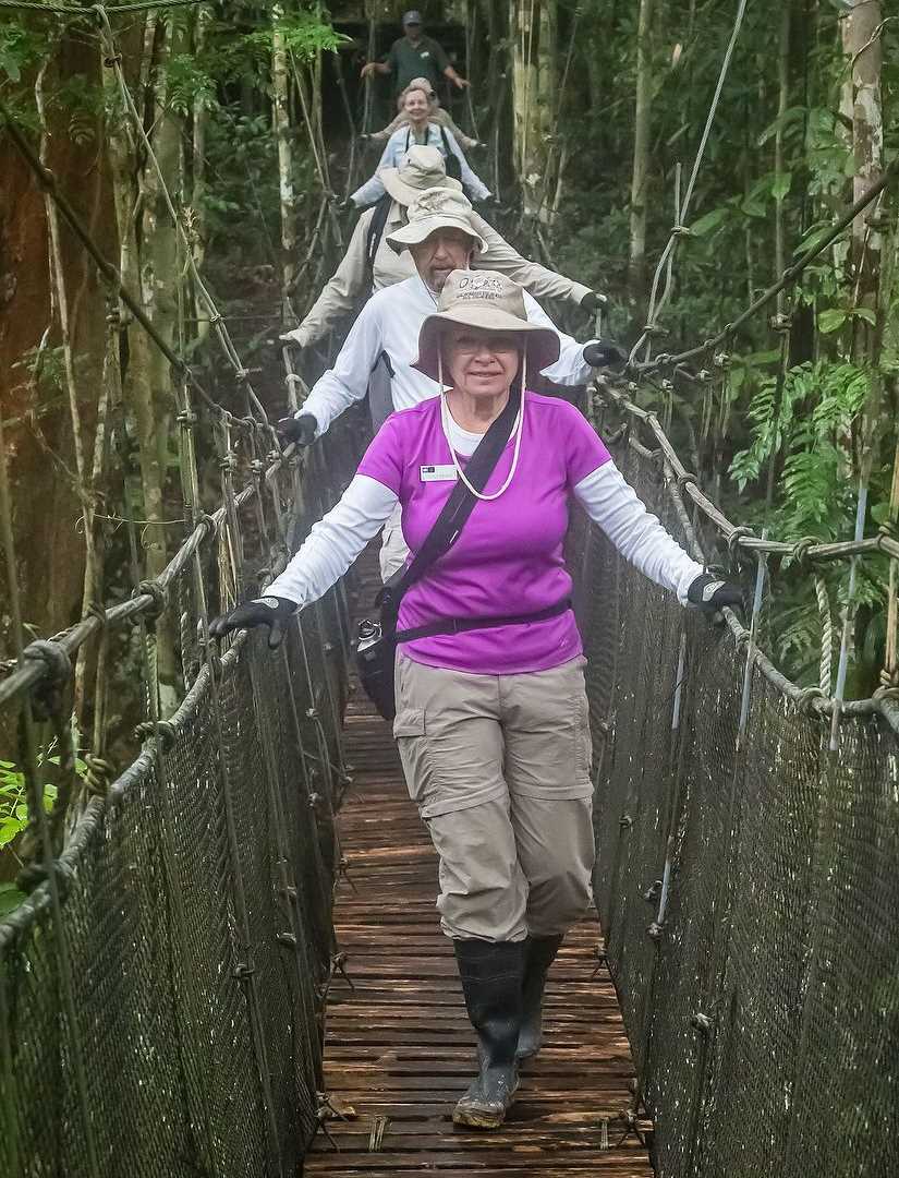 This morning’s treasured finds included a brown-throated sloth, a large green anaconda as well as a red-tailed boa constrictor, red-backed poison frogs, and a pink-footed tarantula to add to the list. An additional highlight to this park is the cable suspension bridge system that allows us to safely access the mid-canopy level of the rainforest.
