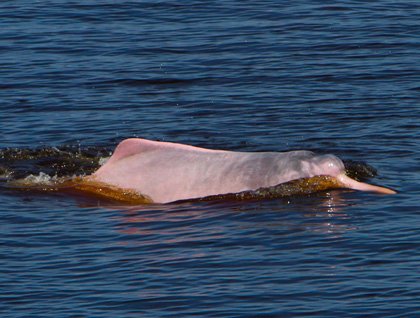 Delfin II repositioned to the Yarapa River. As soon as we tied up to the bank, several tucuxis and pink river dolphins became really active. We were all enjoying a traditional Peruvian lunch and admiring the graceful freshwater cetaceans through the scenic windows of the dinning room.