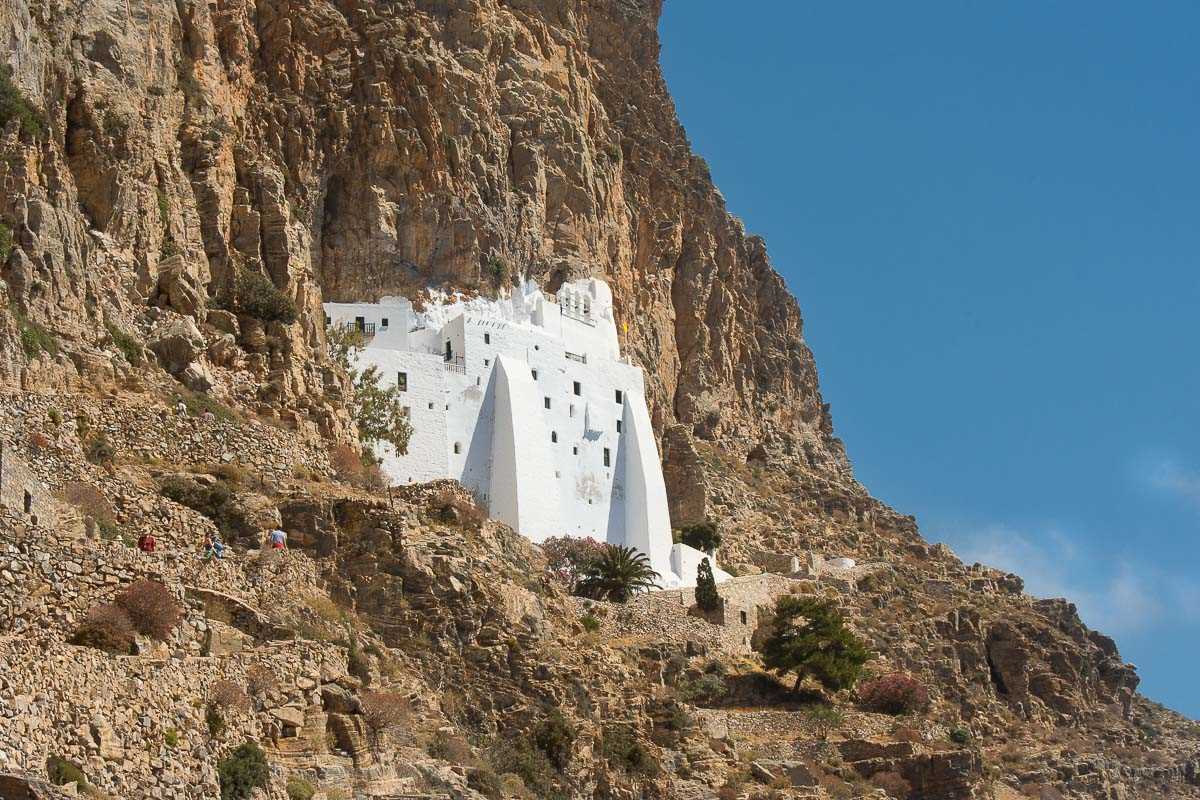 Early this morning Sea Cloud arrived to the Amorgos Island, the most remote of the Cycladic Islands. After a splendid breakfast in the dining room, we all gathered by the gangway eager to disembark at the town of Katapola. After a short scenic drive up and over to the other side of the island we visited the 11th century monastery of Panagia Hozoviotissa, built in honor of the Virgin Mary. As we slowly climbed the 300-plus steps to reach it, we were truly impressed by the location chosen for its construction. The white, eight-story building of this monastery literally hangs from the side of a very steep rocky cliff. After visiting the monastery, we got back on our private bus to backtrack to the hilltop Chora (town), to continue exploring by foot, the narrow, old, stone walkways. We were pleasantly surprised to find after every curve a beautiful, picturesque little café or restaurant. Each one more beautiful than the previous!