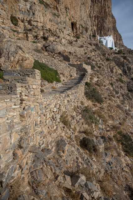 Dawn was silhouetted by the ridges of Amorgos as Sea Cloud dropped anchor off the small port town of Katapola. By the time the first half of the group were ready to disembark by ship’s tender, the sun had peered over the surrounding hills, and the harbor town gleamed white and inviting in the morning light. Once on land, an island bus was available to drive us into town. Along the way several guests exclaimed in wonder when we crested the ridge and saw the wild eastern coastline of Amorgos below and the deep blue expanse of sea before us. When we arrived to the tiny parking lot, many of the guests could scarcely believe their eyes as they alighted to a view of the white monastery of Panagia Hozoviotissa plastered against the immense cliff-side above us. And I say that without exaggeration.
