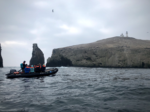 Our day begins as we approach the fog-covered islands that make up Anacapa. This is the only Channel Island with a name derived from its native Chumash name, Anyapakh, meaning “mirage” or “ever-changing.” As the surge moved the water and fog sirens from the east end lighthouse rang, we could not agree with this description more. We explore the island along the cliffs and coastline by Zodiac. It’s heartwarming to see the number of brown pelicans in the area, knowing they faced extinction from the use of DDT just a few decades ago. We are in awe as they glide above us on their way to forage for fish below. Our Zodiac turns the corner to find rafts of curious juvenile California Sea Lions, many that approach us to get a closer look. At the same time our dive team, Katie Mills-Orcutt and Jim Coyer, explore the kelp forests right below us. They find teams of kelp forest fish, hearty lobster, and their own playful pinnipeds. One sea lion mimics Jim’s bubbles as they stare at each other on the sea floor.