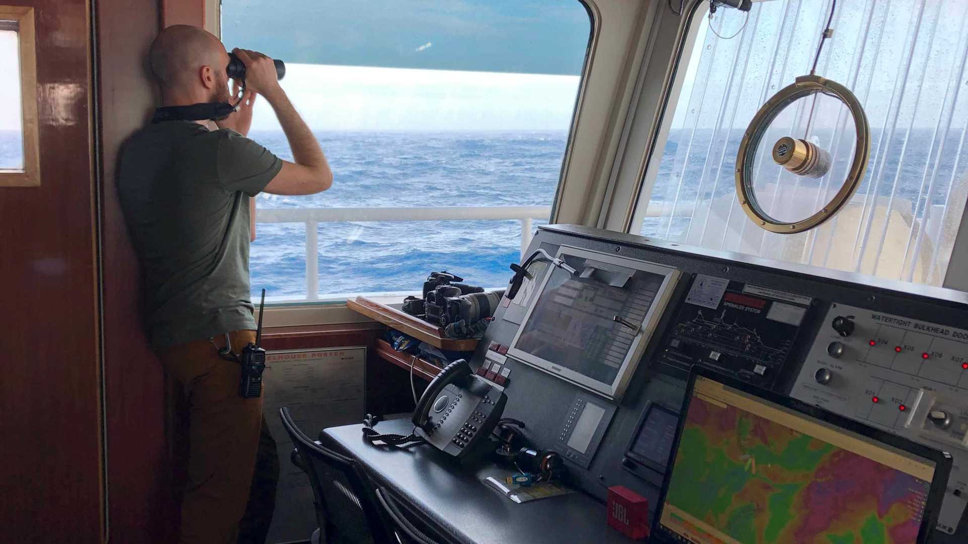 What a day! The full sea experience of the Southern Ocean started somewhere around 1:00 a.m. as conditions in the Drake Passage grew increasingly more turbulent. By mid-morning, there were gusty winds up of up to 50 knots. This did not keep us from getting out on the bridge to find nearby wildlife. We were rewarded with the occasional black-browed albatross and sooty shearwater, but the abundance of seabirds was noticeably low at this time. Our first break came around 9:00 a.m. when we spotted a pod of hourglass dolphins riding the port-side waves coming off the vessel. These were a treat to see, and there was still quite a way to go before entering the Beagle Channel!