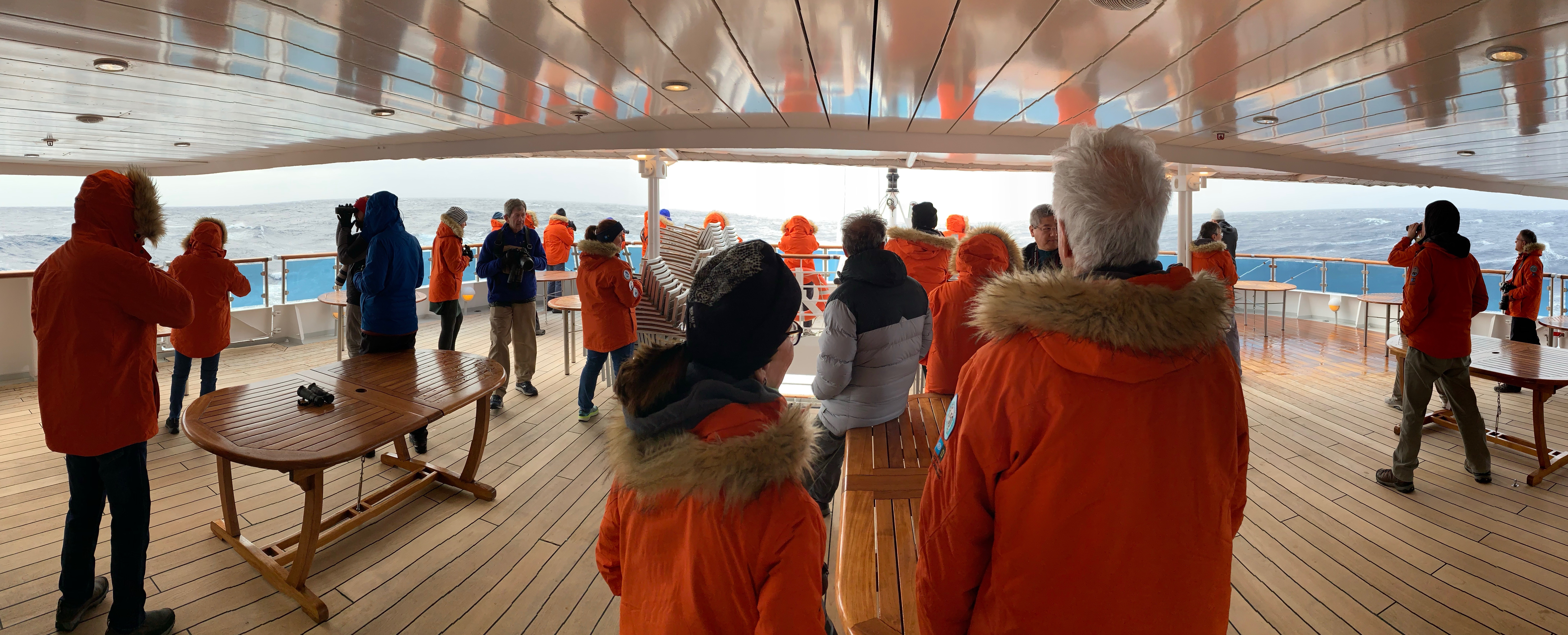 The seas and wind moderated through the night and there was a healthy crowd at breakfast, looking forward to our passage into Antarctic waters, south of 60◦ south latitude. By crossing that line we officially are in Antarctia, though it would take most of the day to transit the Polar Front and make the ecological jump (figuratively) into the colder Southern Ocean. The literal jump into the ocean, a true polar plunge, may well come later on in the voyage.