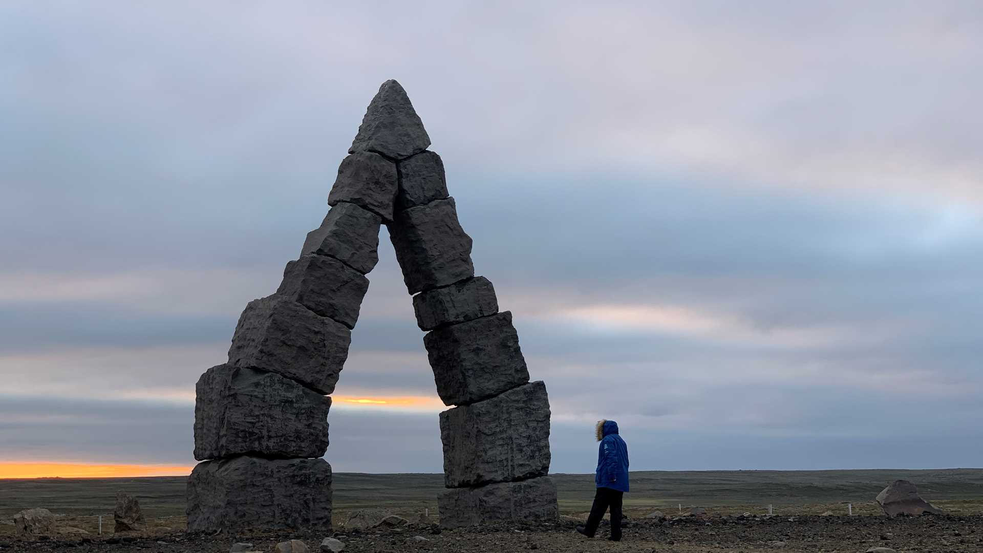 Today on the National Geographic Endurance we took a very special after-dinner excursion to the Arctic Henge in Raufarhofn, one of the most remote villages in Iceland. The Arctic Henge is Iceland’s largest open-air art piece. It consists of large stone arches intentionally placed to line up with the midnight sun, acting like a huge sundial. It celebrates Icelandic culture with allusions to mythology and folklore. It is the brainchild of Erlingur Thoroddsen and is still under construction.