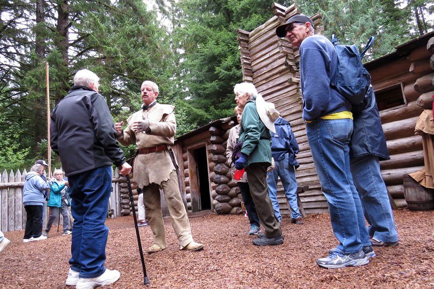Our first stop during the morning was Fort Clatsop, the reconstruction of the 1805-1806 winter fort of the Corps of Discovery. We saw a film about the winter at Fort Clatsop and had some interpretation before visiting the replica of the fort and a walk down to the landing where the Corps’ canoes landed. We then headed back to Astoria for a visit to the 125-foot tall Astoria Colum. The exterior of the column is decorated with a spiral mural depicting the history of the area, beginning with American Captain Robert Gray who was the first sea captain to negotiate the Columbia Bar and who claimed the Oregon Country for the United States. Some guests climbed the interior stairway of the column to launch balsa-wood airplanes from the top.