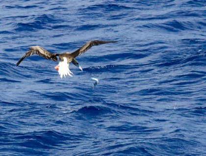 These presentations are punctuated by forays out on deck to observe the wildlife putting on a spectacular display despite being far out of sight of land in the middle of the Coral Sea. Red Footed Boobies soar over an unbroken horizon, streamlined bodies effortlessly gliding in the lee of the ship. This gracefulness is punctuated by frenzied bursts of activity as the ship’s passage disturbs schools of flying fish, sending them skipping over the wave-tops, pectoral fins extended as they catch gusts of wind and glide away from the perceived threat we represent. Unfortunately the plot thickens as this brief absence from their marine environment leaves them exposed and vulnerable to be plucked out of midair by the aerial predators patiently waiting high above. Some are luckier than others and despite being nabbed and taken to new heights, manage to wriggle free from sharp beaks and into the safety of the depths below. Marveling at such visual treats is even more exciting knowing that there are more surprises in store on the yet to be written pages of our expedition that lies ahead.