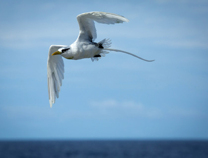 The dawn welcomed us with calm seas and blue skies dappled with clouds, lovely conditions for a day at sea. At some point during the night, a white-tailed tropicbird crash landed on the ship, but it was a simple rescue, and Richard gave everyone a close-up lesson about the bird before he released it from the aft deck. Eagle eyes were on deck scanning the waters throughout the day, but sightings were limited to the occasional lone seabird.