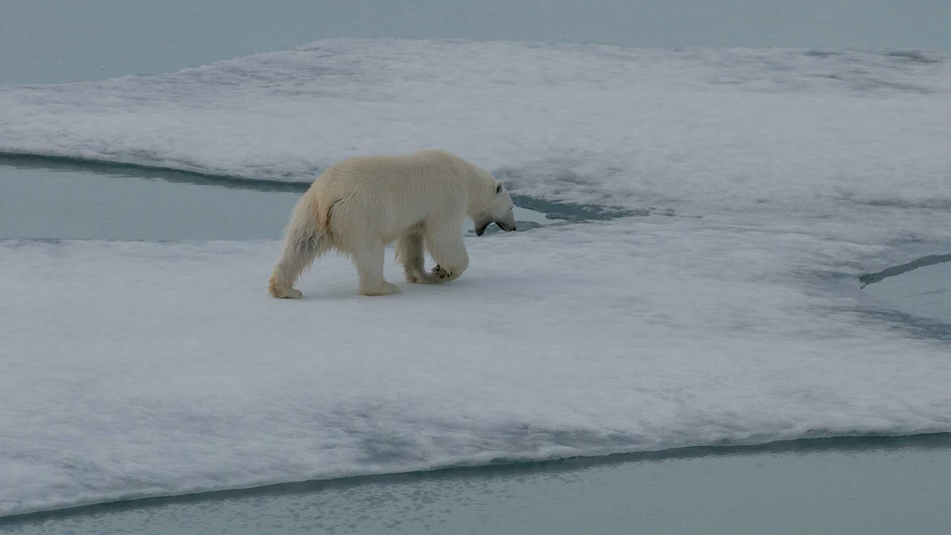 The first bear was spotted as we were finishing breakfast. National Geographic Resolution slowed to a crawl and then stopped, but the bear showed little interest in us and soon wandered away across the ice. The captain soon had us moving again, eager to reach a huge sheet of ice he had been watching for days on the satellite images.