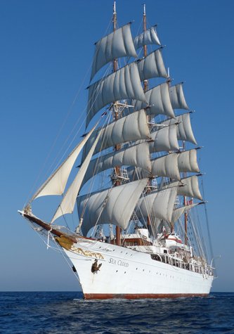 If today was yesterday, we would have carried our sacrifice and petition to the oracle of Apollo requesting fair winds for the morning. We did not desire a blustery blow but simply a gentle enough breeze to attain a forward momentum less than four knots when most sails were set. Of course that would be illogical if our goal was to put miles beneath our keel. What we really wanted to do was to hop into our little rubber Zodiacs, speed away from the Sea Cloud and photograph her magnificence. And that is exactly what we did! There were smiles as big as all outdoors and the day had barely begun. Oh yes, there was activity before that time. The sun did rise behind the hills of Turkey and dolphins leapt as they accompanied a Coast Guard vessel. But the highlight of the day was definitely the Sea Cloud under sail.