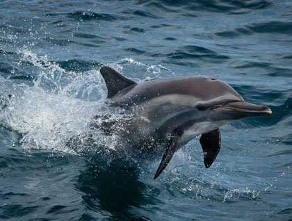 By dawn, the National Geographic Sea Lion was in the waters of the Loreto Bay National Marine Park. The first rays of light tinted the nearby mountains of the Sierra de la Giganta rosy red as we ventured along the eastern shores of Isla del Carmen. Winds were whipping down from that island’s high desert hills, so we soon turned back to pass around Carmen’s southern tip. We soon encountered a very large group of long-beaked common dolphins. It seemed that our delight in watching them was equally matched by their exuberance at our ship’s approach, as they continually came bounding towards our ship to bow-ride, racing along, leaping in the air being pushed along by our ship’s pressure wave. There were many hundreds of dolphins in this expansive group, as well as many mothers with young calves.