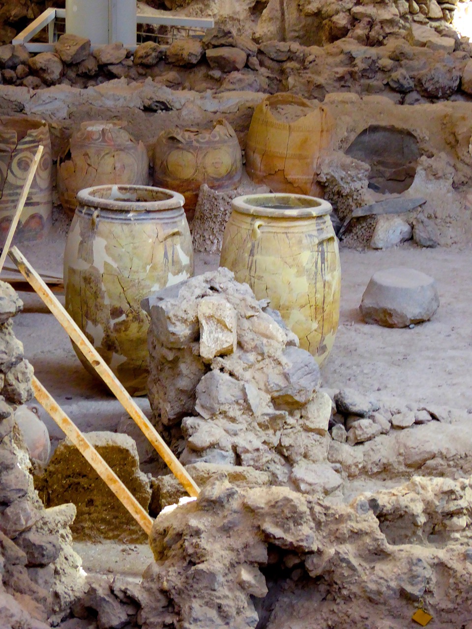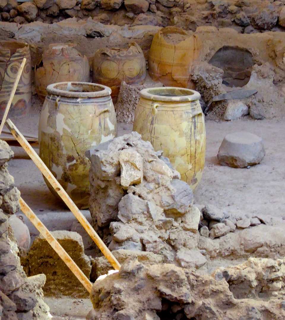 Buried in volcanic ash 1500 years before Pompeii, the Minoan site of Akrotiri is eerily fascinating. The muted gray and earth tones of the ancient stones, the now silent streets that run the length of the site, empty bed and table frames all help to draw you into the drama of the situation when the Minoans realized that they had to flee their homes or perish. We might never know their individual fates but they left behind frescoed houses and shops filled with wares stored in large pithoi hoping to be able to return and restart their lives.