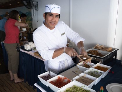 We came on deck first thing this morning to a sparkling sea and a horizon decked with tropical islands. Since we arrived in Lautoka yesterday, the biggest port on the west side of Vitu Levu, we have been steaming east for the more remote, outer islands. We are in the narrows between Taveuni, “The Garden Island,” to starboard and a peninsula of Vanua Levu, the second largest to the north. Scattered seabirds were fishing over the current streams between the islands: tropicbirds, sooty terns, shearwaters, and both Tahiti and collared petrels. We are blessed today with lighter winds and a choice of sheltered bays, so we seek a haven among the maze of coral reefs in this far corner of Fiji. By way of an introduction to the geography, culture and customs of Fiji, Mike gave an entertaining talk called “Bula!” (the emphatic greeting with which locals hail all visitors). Divers then met with Erin and Paul in the lounge to discuss safety procedures, followed mid-morning by a talk on protocols for Zodiac operations, kayaking and snorkeling. Straight after this our eager frogmen and frogwomen stormed Deck 6 to choose masks, snorkels, rash vests, flotation devices and wet suits in a quest for the perfect fit. Business was brisk, and we managed to satisfy most customers before an early lunch call. No rest for the wicked! By 1330 the first Zodiacs were headed inshore packed with the vivid black, yellow, blue, and purple livery of committed snorkelers. Kayaks had been set up ashore under the tall coconut palms for paddlers, divers were soon no more than rising bubbles, folk enjoyed a swim in the shallows, and the GBZ (“glass bottomed Zodiac”) patrolled the reef edge with its blue window on the wonderful world of coral. Drifting with engines off, to the sounds of forest bird calls wafting over the water, we skirted mangroves, circled coral heads, and gazed in awe upon electric blue damselfish, darting surgeons, elegantly plumed Moorish Idols, the sluggish silhouettes of sea cucumbers, the dread crown-of-thorns starfish, the wavy smile of giant clams, and tall orange sponge chimneys. It was clear from coral debris that this reef has been pummeled by a cyclone in the last couple of years, but fresh coral growth shows that the reef is recovering well from the onslaught. We were delighted to see a young hawksbill turtle right beneath the Zodiac, a special treat capped only by the arrival (announced by the ringing of a Zodiac bell) of Magnum ice creams, probably one of the rarest species on any tropical reef, and unsurprisingly, rapidly extinct.