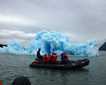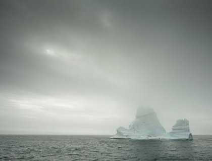 Continuing west, a thin band of light slipped into view during a break in the fog. Nearly indistinguishable from grey sky, our initial glimpse of east Greenland began to take shape around 3pm. Folded into the horizon, the dark flanks of Scoresbysund emerged first, offset by the Rorschach remains of winter’s snowfall, to be followed eventually by a thin band of glacial ice underlining the skyline. Within two hours of this welcomed sight, we were at the 12-nautical-mile-wide entrance of this massive, flooded glacial valley with a sentinel of ice between us and the innards of the fjord system beyond. Emerging from the fog a lone, spire-like iceberg drifted motionless at the entrance, reaching just high enough into the low atmosphere to create its own, tiny microclimate overhead. Our approach and subsequent circumnavigation of the trip’s first substantially sized piece of ice lasted nearly 60 minutes, with a barrage of images to show for it.