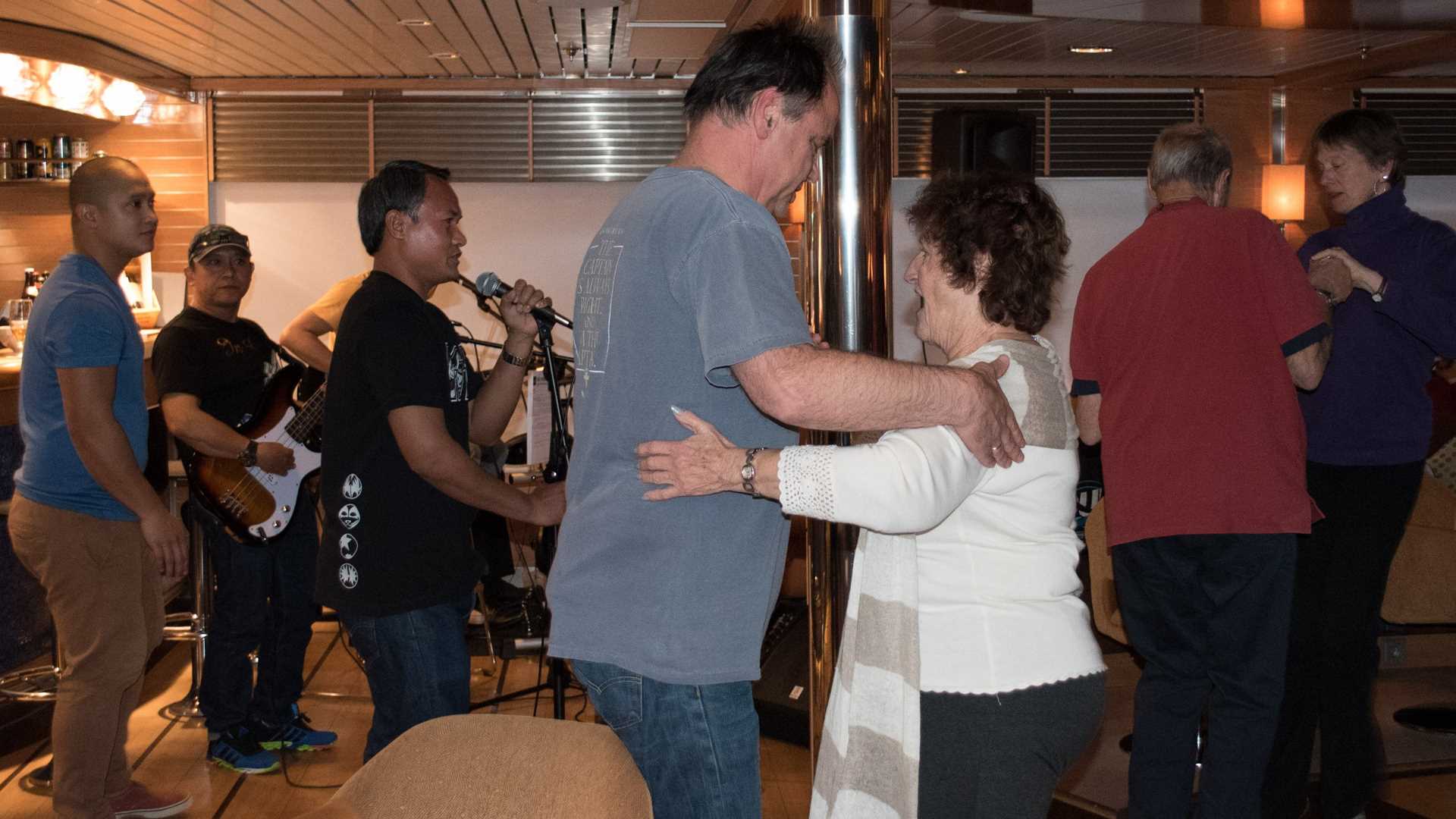Shortly before recap we began to see the geography of Iceland off the port side of the ship and have officially left the Arctic Circle! We sailed into one of Iceland’s fjords, a sheltered area, to anchor for the night. During tonight’s recap we saw a superb preview from the video chronicler of the voyage and after dinner we enjoyed a performance by the crew band, the “Spice Boys”. We danced until the sun went down, experiencing our first sunset in two weeks.