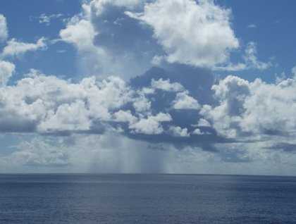 Sea conditions today were perfect. Of course, if National Geographic Orion were a sailing ship, we would probably have not enjoyed the day so much as we would have been becalmed. We were “like a painted ship upon a painted sea.” As far as the eye could see, there were puffy clouds scattered about, many of which produced picturesque reflections. It was a bit odd that there appeared to always be less cloud coverage overhead than anywhere else. This optical illusion was caused by the foreshortened lower angles of our views towards the horizon, making the clouds looked more concentrated farther away in all directions. Even so, we could observe several huge isolated cumulo-nimbus thunderheads here and there that were dumping huge amounts of concentrated rain into the ocean. This seemed a waste of freshwater when one considers the many drought-stricken terrestrial areas around the world.