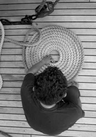 Additional sails were furled at 9 a.m. and Tom O’Brien gave an illustrated talk on the sails and rigging. The staff was introduced to the guests at 10:30 and we had a very nice lunch at 12:30. Tom Heffernan introduced the extraordinary story of Diamond Rock—a basalt lava plug almost 580 feet high, which sits three kilometers off the southwest of Martinique—and its capture by the English troops in January of 1803 and its subsequent recapture by the French under Admiral Villeneuve on 3 June 1805. The English Admiralty actually commissioned the rock “HMS Diamond Rock” on the 7th of February 1804. The first time, I believe, a massive fixed, immoveable basal mountain was turned into a naval vessel. Tom Heffernan then gave a lecture entitled “Trinkets, Sugar, and Slaves: White Gold and the Triangular Trade,” a history of the slave trade and sugar in the West Indies. The sails were reefed at 5:30 and many took the opportunity to photograph the seamen as they climbed aloft. The main mast, the tallest mast on the Sea Cloud, is 185 feet high. One needs to very skilled and a tad fearless to climb it, particularly in the wind when the ship is moving.