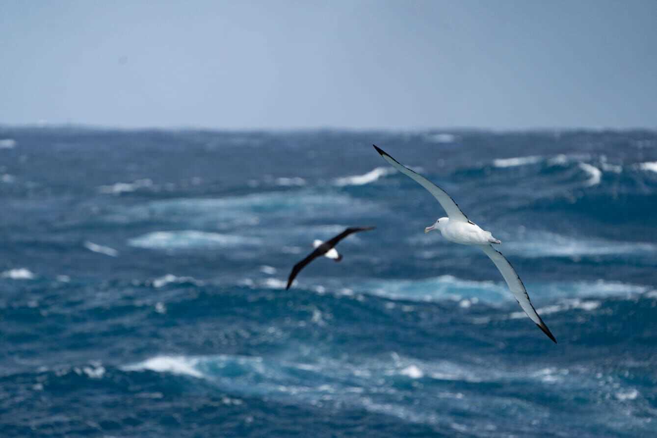 On this crossing, we have been lucky enough to view the largest seabird of them all, the wandering albatross. This bird can have a wingspan of two meters, over six feet. Wandering albatrosses are monogamous and mate for life. With long lives, sometimes these animals produce offspring into their 60s. Royal albatrosses are their slightly smaller counterpart, and they tend to be rarer in this part of the world. With more black coloring on their wings and a less pink bill, they are a species that may be easily confused with the wanderer.