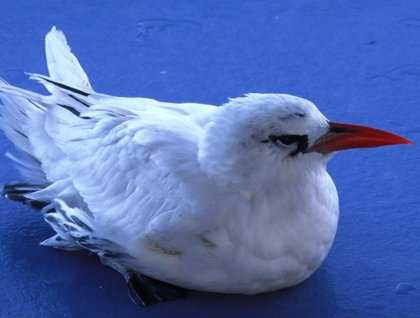 Early this morning as the sun rose a seabird was found on deck. A red-tailed tropicbird had become stranded overnight, most likely disorientated by the lights of the ship and once on board it struggled to take off again without assistance. It attracted quite a crowd but was unflustered by the attention and, unharmed by the experience, it flew off strongly on release.