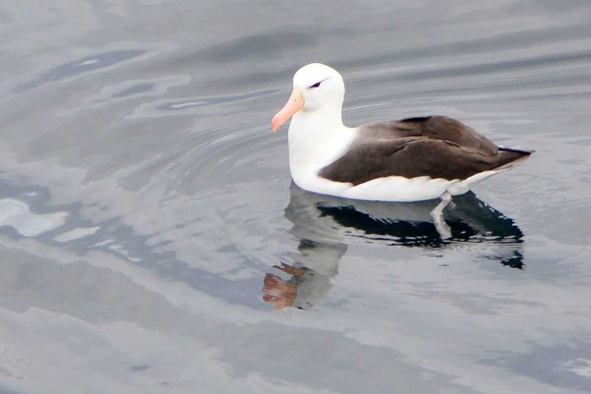 Today there is not much wind at all, so the big birds flap around a bit, soar a little less, and often just sit on the water. I wonder how the birds feel about this lack of wind. I watched the black-browed albatross, they are the biggest birds out there now, and I could not tell if they were smiling, frowning, or even pouting…inscrutable!