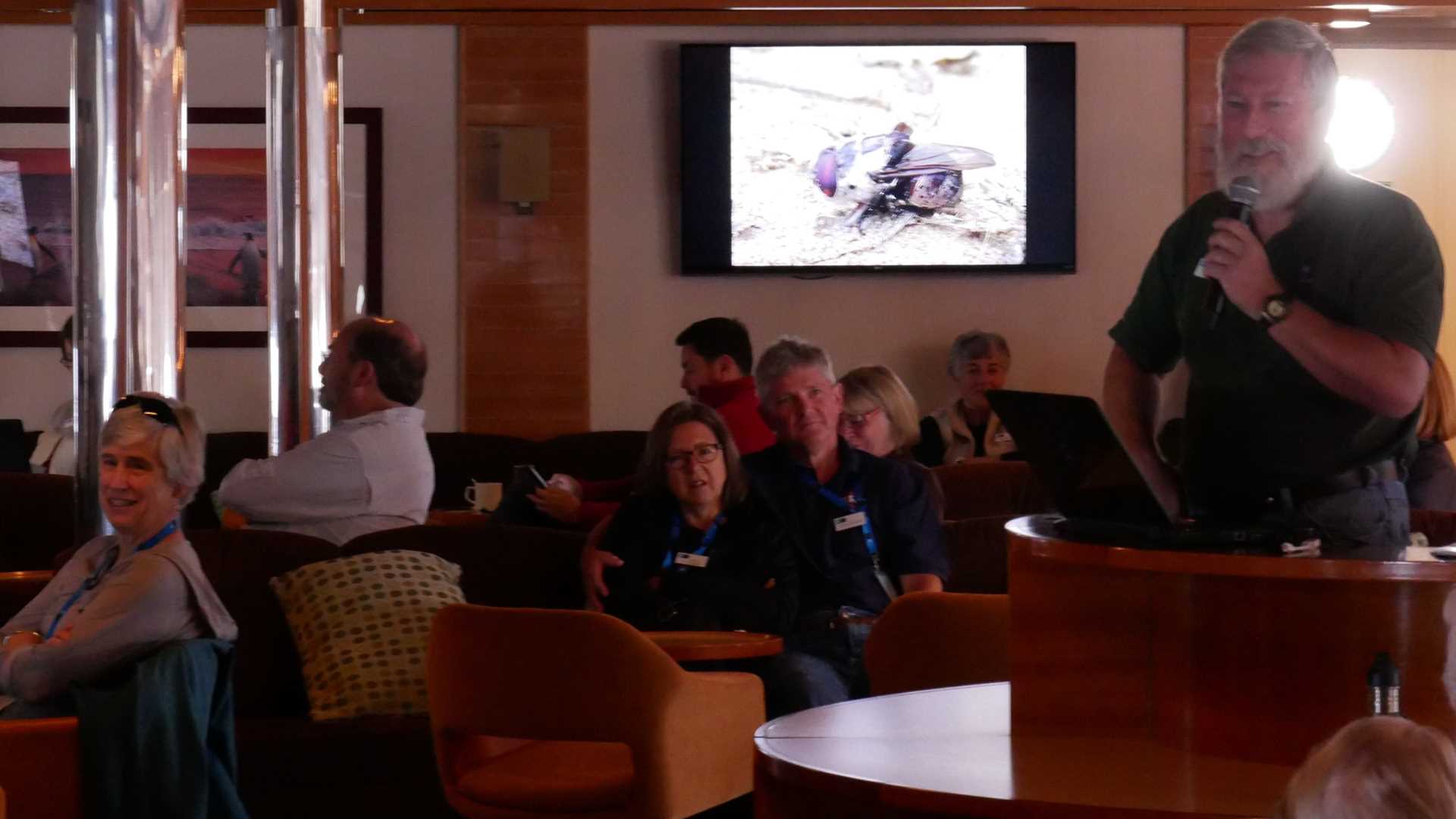 In the main lounge, as views of icebergs appeared and disappeared out the windows, we settled in for a day of intellectual stimulation through talks and lectures from our specialists onboard. The first presentation was by Global Perspectives guest speaker Bob Bindschadler, a renowned NASA scientist who has studied Antarctic glaciers for decades. Bob’s talk, called “Earth’s Bi-polar Disorder,” used the glacier story to make an ironclad case for the reality of climate change. Guests who heard the talk used superlatives to describe the clarity and the impact of the presentation.