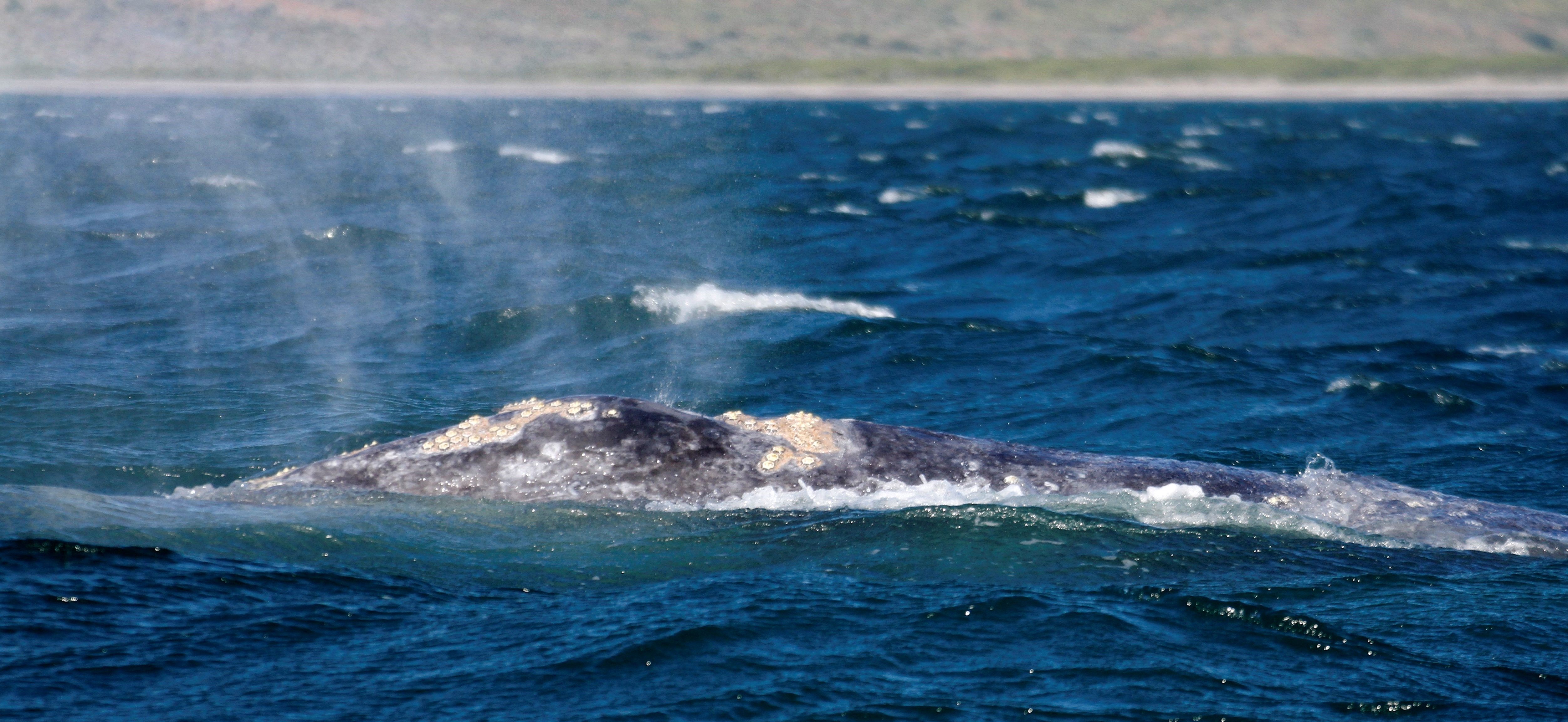 This morning, National Geographic Venture docked at the interesting port, San Carlos. From the 1940s to the 1990s, the port was used for loading agricultural products and fertilizers from the nearby Santo Domingo Valley. Nowadays, San Carlos is basically a place for loading sardines from a local cannery. It is also an important tourist base for whale-watching, principally mating gray whales. At the port, all guests and staff boarded buses to Lopez Mateos, a town located near the northernmost tip of Magdalena Island. The buses traveled across Magdalena Plain, a section of the Sonoran Desert that receives a lot of moisture in the form of dense fog from the Pacific Ocean. Lichens and orchillas, a type of flowering plant, give the desert a phantasmagoric appearance. Guests and staff enjoyed spotting numerous birds, including crested caracaras and kestrels. Once in Lopez Mateos, we boarded local pangas for whale-watching. During two rounds of whale-watching, we encountered several whales close to our pangas. However, most of the whales were preoccupied with traveling, searching for mates, or just finishing their time of reproduction and thus exiting the lagoon. In reality, the whales were not interested in interacting with the boats and their excited cargo, but we had many opportunities to observe the behavior of these magnificent animals. In town, we all delighted in a delicious fish lunch, ‘pescado zarandeado.’ We enjoyed exploring the local dock with its many colorful shops and crafts, and we admired the wonderful sculpture of a cow-calf pair of gray whales.