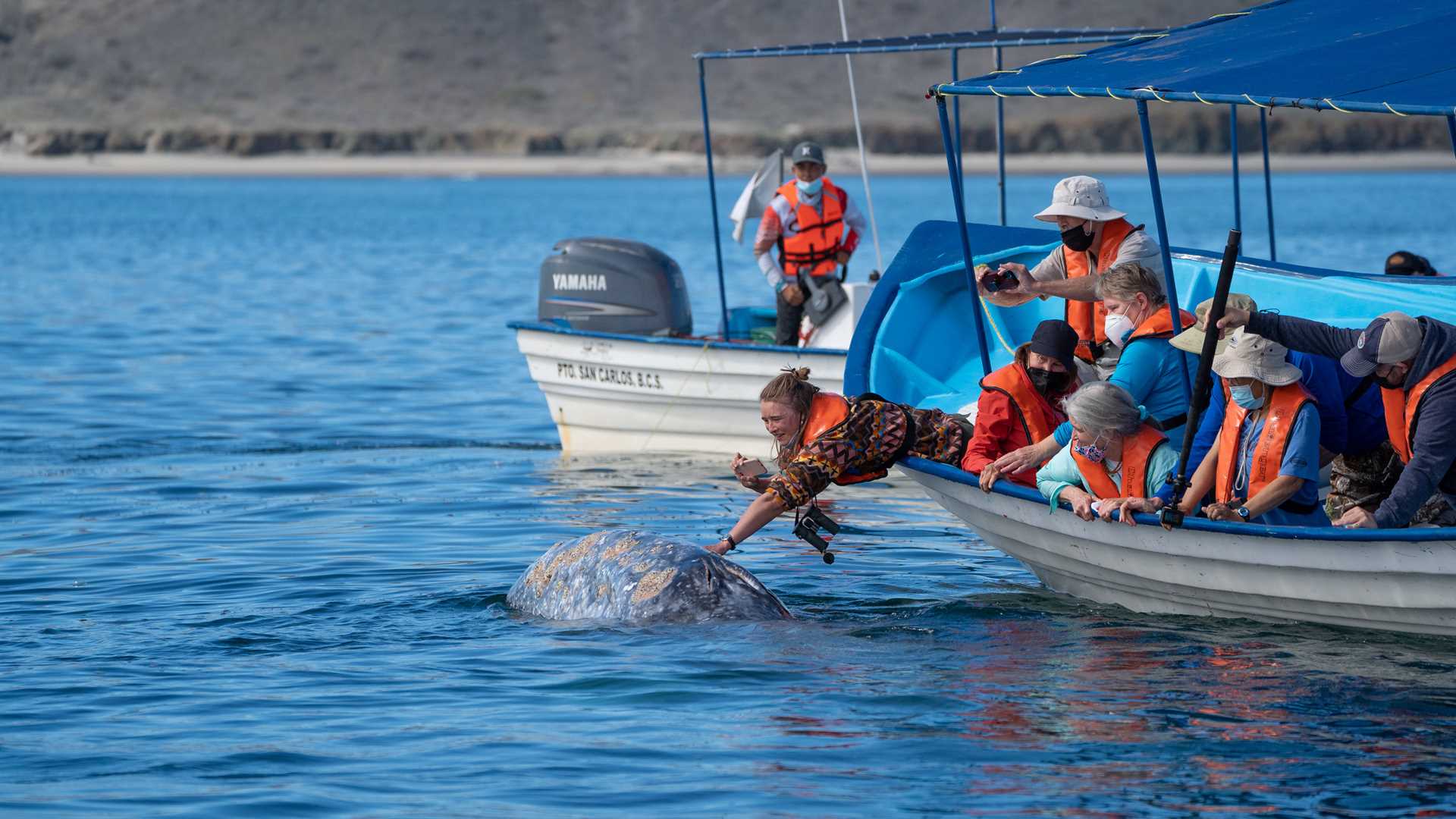 Today, we woke to an absolutely incredible sunrise as we anchored at Isla Santa Margarita. After breakfast, we boarded pangas and rode to Bahia Almejas with the sun shining on our smiling faces. It was not long before we saw the telltale heart-shaped blows of gray whales. Whales quickly surrounded us on all sides, showing off for one another. We were in a mating area, so it was common to see spyhopping, breaching, and breathtaking clusters of whales. We were treated to a friendly visitor today, as one whale came right over to us. The whale spent about 45 minutes with us, allowing guests in each panga to pet its face. This is such a rare treat, one burned in our memories forever. As this close encounter with such a gentle animal unfolded, shouts of joy were heard.