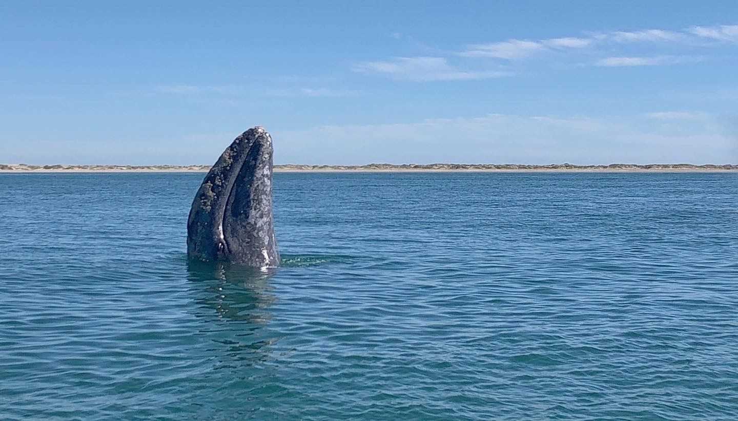 This morning, National Geographic Venture docked at the interesting port, San Carlos. From the 1940s to the 1990s, the port was used for loading agricultural products and fertilizers from the nearby Santo Domingo Valley. Nowadays, San Carlos is basically a place for loading sardines from a local cannery. It is also an important tourist base for whale-watching, principally mating gray whales. At the port, all guests and staff boarded buses to Lopez Mateos, a town located near the northernmost tip of Magdalena Island. The buses traveled across Magdalena Plain, a section of the Sonoran Desert that receives a lot of moisture in the form of dense fog from the Pacific Ocean. Lichens and orchillas, a type of flowering plant, give the desert a phantasmagoric appearance. Guests and staff enjoyed spotting numerous birds, including crested caracaras and kestrels. Once in Lopez Mateos, we boarded local pangas for whale-watching. During two rounds of whale-watching, we encountered several whales close to our pangas. However, most of the whales were preoccupied with traveling, searching for mates, or just finishing their time of reproduction and thus exiting the lagoon. In reality, the whales were not interested in interacting with the boats and their excited cargo, but we had many opportunities to observe the behavior of these magnificent animals. In town, we all delighted in a delicious fish lunch, ‘pescado zarandeado.’ We enjoyed exploring the local dock with its many colorful shops and crafts, and we admired the wonderful sculpture of a cow-calf pair of gray whales.