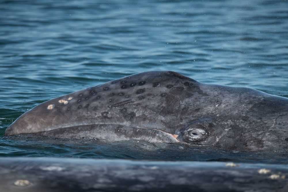 After another stunning sunrise in Magdalena Bay, we were very lucky to get the gift of spending nearly two hours with the friendliest whale seen in the lagoon in years, Olivia, and her daughter Keira. Olivia was calm and would approach our boats slowly, then close her eyes as people would rub her head, as if she was really enjoying the contact. The calf, Keira, on the other hand, would be very very playful, and as one guest remarked: “We are all the toys in the baby’s bathtub now!” Keira would push boats around, would climb onto mom’s tail or head and then slide off, and would come up from right underneath the expedition landing craft to surprise us and look at us. All of us got a chance to gently rub her head and belly.