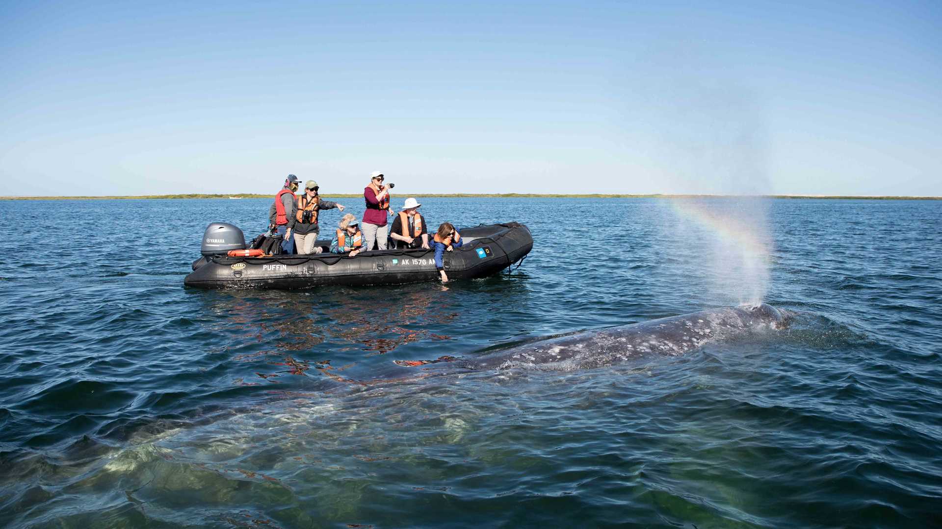 This morning, National Geographic Venture docked at the interesting port, San Carlos. From the 1940s to the 1990s, the port was used for loading agricultural products and fertilizers from the nearby Santo Domingo Valley. Nowadays, San Carlos is basically a place for loading sardines from a local cannery. It is also an important tourist base for whale-watching, principally mating gray whales. At the port, all guests and staff boarded buses to Lopez Mateos, a town located near the northernmost tip of Magdalena Island. The buses traveled across Magdalena Plain, a section of the Sonoran Desert that receives a lot of moisture in the form of dense fog from the Pacific Ocean. Lichens and orchillas, a type of flowering plant, give the desert a phantasmagoric appearance. Guests and staff enjoyed spotting numerous birds, including crested caracaras and kestrels. Once in Lopez Mateos, we boarded local pangas for whale-watching. During two rounds of whale-watching, we encountered several whales close to our pangas. However, most of the whales were preoccupied with traveling, searching for mates, or just finishing their time of reproduction and thus exiting the lagoon. In reality, the whales were not interested in interacting with the boats and their excited cargo, but we had many opportunities to observe the behavior of these magnificent animals. In town, we all delighted in a delicious fish lunch, ‘pescado zarandeado.’ We enjoyed exploring the local dock with its many colorful shops and crafts, and we admired the wonderful sculpture of a cow-calf pair of gray whales.